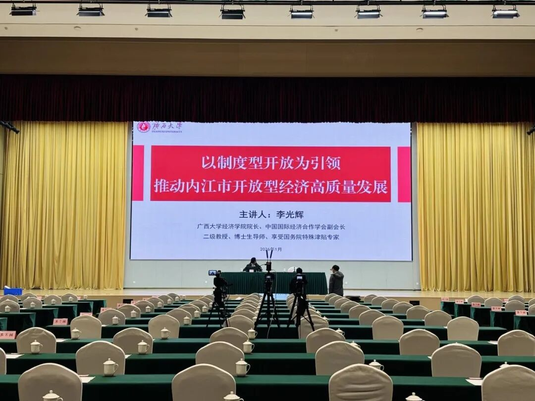 On January 30,2026, at the request of the People's Government of Neijiang Municipality, Academic Dean Li Guanghui delivered a thematic speech titled "Guided by Institutional Openness to Promote High-Quality Development of Neijiang's Open Economy." Leaders of the People’s Government of Neijiang Municipality including Zhang Yong, Ma Ju, and Jiang Wei attended the speech session. Vice Mayor Lan Xu presided over the event and delivered a remark.