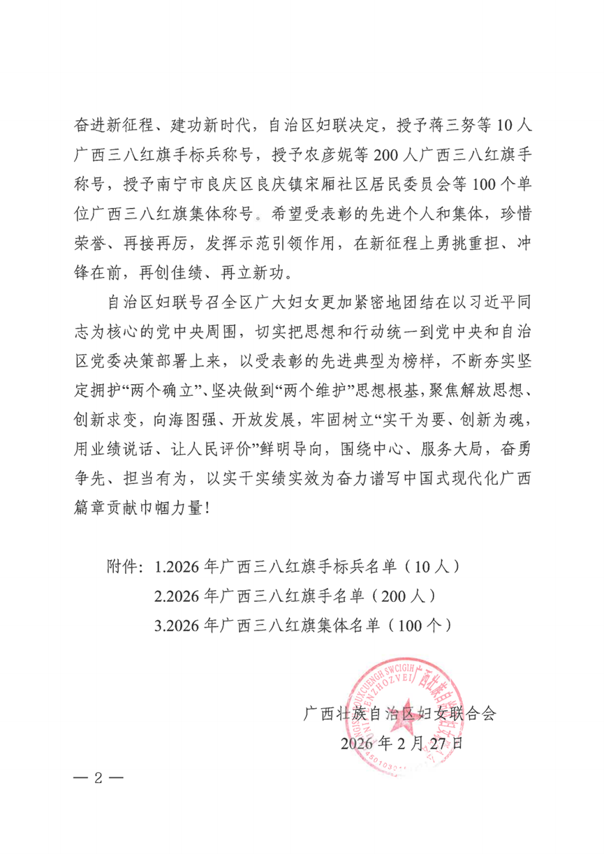 The Guangxi Zhuang Autonomous Region Women's Federation issued the "Decision on Commending the 2026 Guangxi March 8th Red-Banner Pace-Setters, Guangxi March 8th Red-Banner Holders, and Guangxi March 8th Red-Banner Collectives." Professor Wang Han from the School of Economics at Guangxi University was awarded the honorary title of "Guangxi March 8th Red-Banner Holder." This commendation aims to establish advanced models and inspire the majority of women to strive for excellence on the new journey. The year 2026 marks the 105th anniversary of the founding of the Communist Party of China and the beginning of the 15th Five-Year Plan. Across the autonomous region, a large number of outstanding individuals and collectives have emerged, making dedicated efforts and achieving remarkable accomplishments in various industries and fields. Professor Wang Han earned this honor through strict selection and recommendation at various levels, thanks to her outstanding performance in teaching, scientific research, and social services.