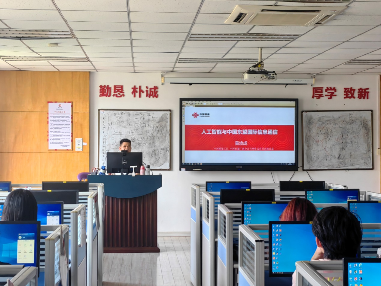 4月25日,公司国际经济与贸易系在《电子商务理论与实践》课程中创新开展校企联合教学实践,邀请中国联通广西分公司网络运营部高级总监黄焕成走进本科课堂,以“行业专家+场景教学”模式,为员工带来《人工智能与中国东盟国际信息通信》专题授课。
