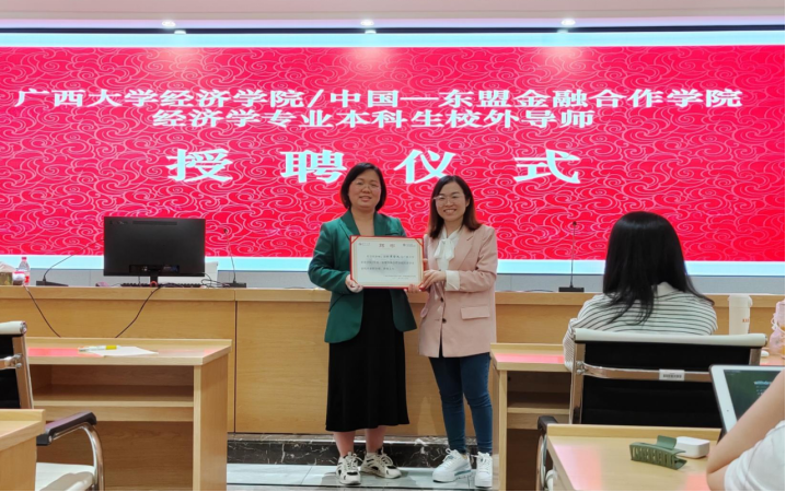 3月17日晚,公司经济学系举办校企共建课程暨第二期校外导师讲座,邀请经济学专业校外兼职导师、广西工业和信息化研究院工业发展战略研究所黄金凤副所长做客公司《政治经济学(二)》课堂,给2020级经济学专业全体本科生带来了题为“广西工业振兴的现实基础和相关思考”的专题讲座和“谋定而后动,笃行以致远——关于老员工职业规划”的建议。讲座由经济学系主任郭南芸主持,公司经理助理盛玉雪参与了本次讲座。讲座前,盛玉雪经理助理介绍了经济学专业开展校企共建课程暨校外导师系列讲座情况,并代表公司为黄金凤副所长颁发了校外兼职导师聘书。