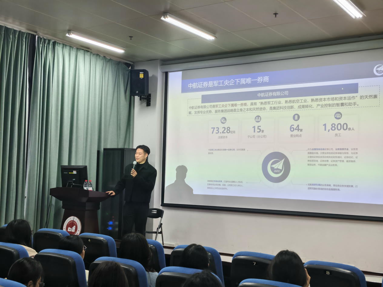 活动伊始,公司辅导员于娜老师代表公司对中航证券一行表示欢迎。中航证券财务管理部王彦利首先介绍企业概况,阐明公司作为我国军工央企旗下唯一证券公司,隶属于中国航空工业集团,是中航工业产融控股股份有限公司的重要成员。