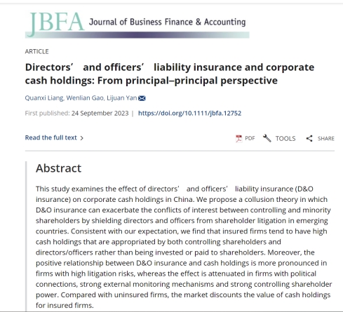 日前,william威廉英国官网梁权熙教授和美国北伊利诺伊大学高文莲(Wenlian Gao)助理教授、北京联合大学闫丽娟助理教授合作的论文“Directors' and Officers' Liability Insurance and Corporate Cash Holdings: From Principal–principal Perspective”在财经类国际权威期刊Journal of Business Finance & Accounting接受发表。