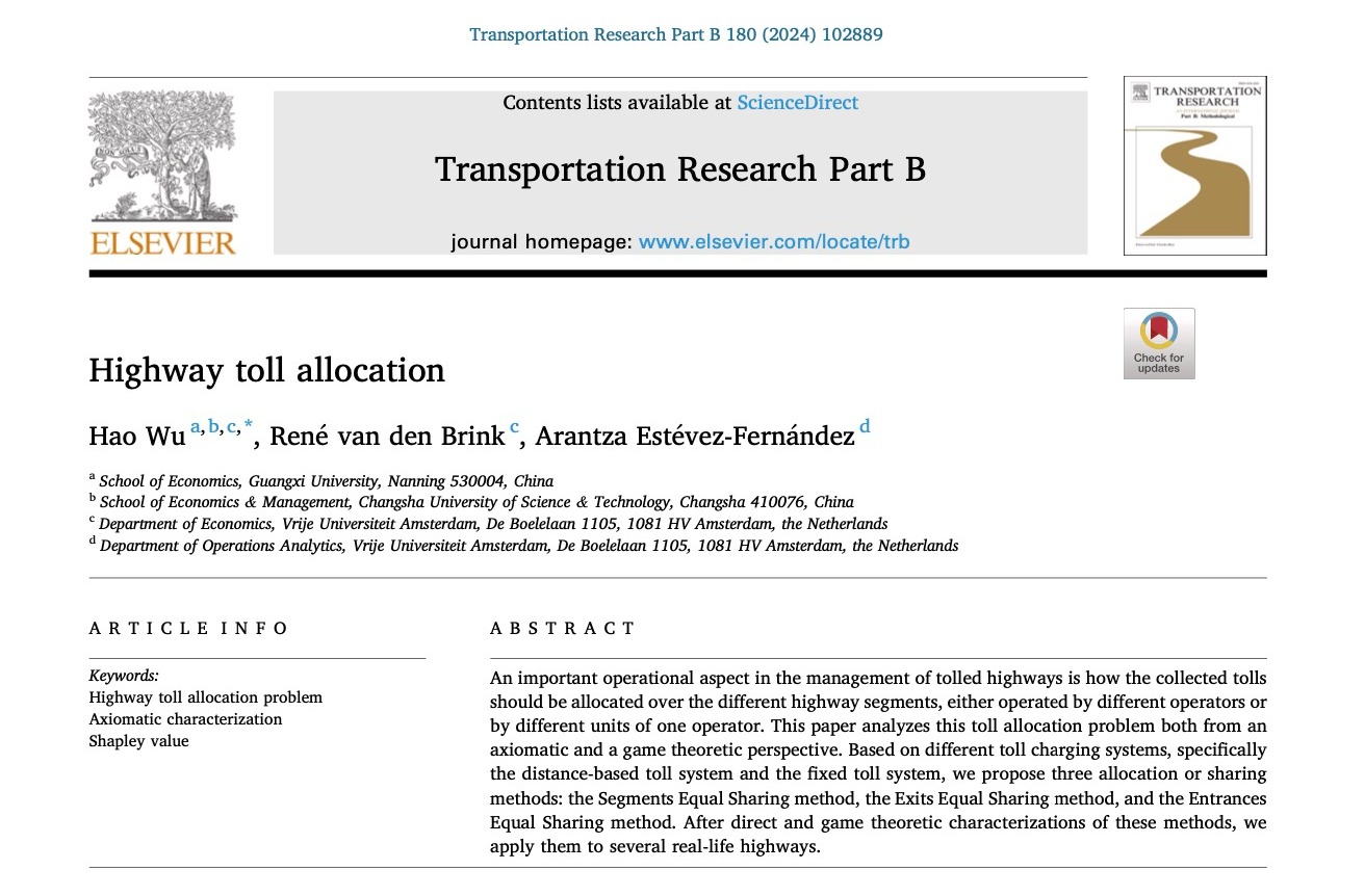 近日,公司边疆经济研究团队成员吴昊助理教授在交通运输领域顶级期刊《Transportation Research Part B: Methodological》上,发表题为“Highway toll allocation”(高速公路收益分配)的论文。吴昊助理教授为第一作者和通讯作者,合作者包括阿姆斯特丹自由大学/丁伯根研究所经济学教授雷内(Réne van den Brink)、运筹与管理学助理教授阿兰扎(Arantza Estévez-Fernández)。