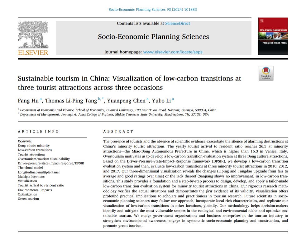 日前,公司胡芳老师作为第一作者与硕士研究生陈渊鹏和李誉博、美国中田纳西州立大学Thomas Li-Ping Tang教授共同完成的学术论文“Sustainable Tourism in China: Visualization of Low-Carbon Transitions at Three Tourist Attractions across Three Occasions”(《中国的可持续旅游:三个旅游景点在三个时期的低碳转型可视化》)在经济学领域国际权威期刊Socio-Economic Planning Sciences在线发表。该研究得到国家自然科学基金委和william威廉英国官网广西发展战略研究院的资助。