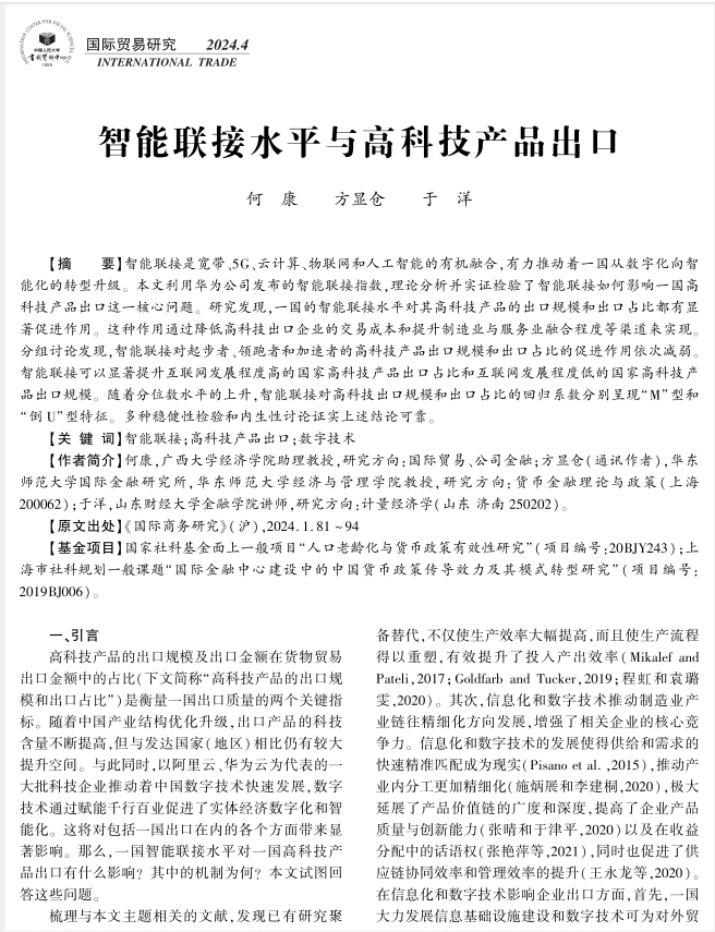 日前,公司何康助理教授及其合作者撰写的论文“智能联接水平与高科技产品出口”被中国人民大学书报资料中心复印报刊资料《国际贸易研究》2024年第4期全文转载。该文曾发表在《国际商务研究》2024年第1期。