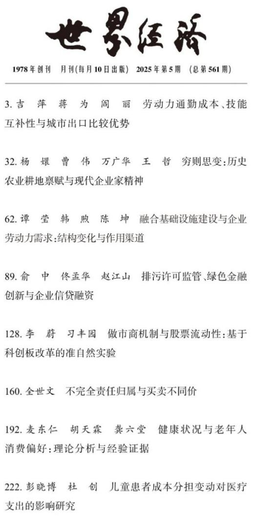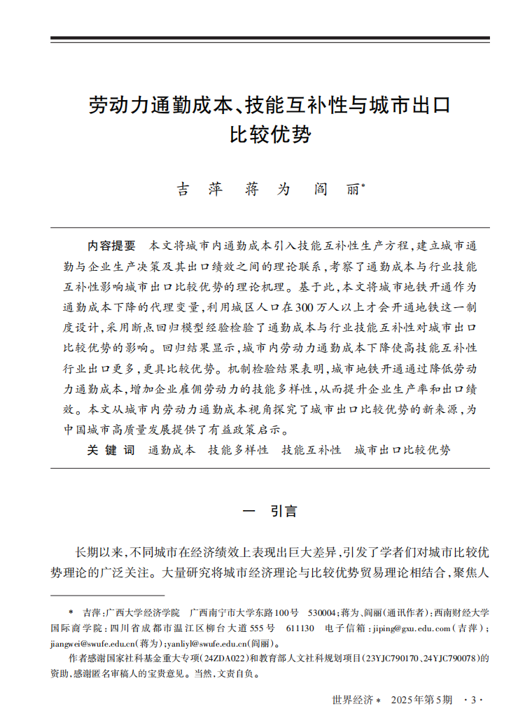 近日,公司助理教授吉萍与西南财经大学教授蒋为、讲师阎丽合作的论文《劳动力通勤成本、技能互补性与城市出口比较优势》在《世界经济》期刊2025年5月刊发表。