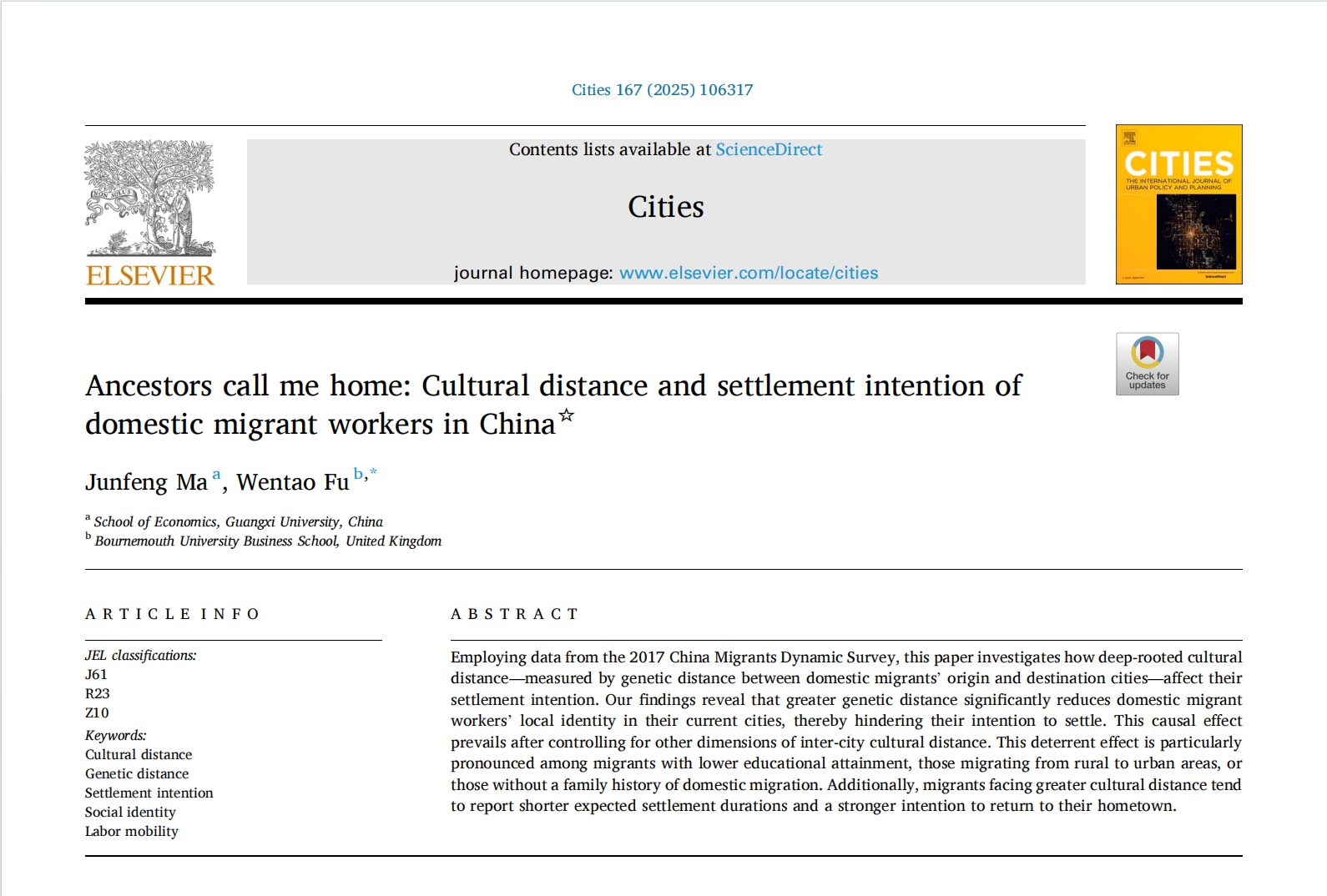 近日,本公司马俊峰助理教授与Bournemouth University商公司付文韬教授合作的论文“Ancestors call me home: Cultural distance and settlement intention of domestic migrant workers in China”在《Cities》期刊正式发表。马俊峰助理教授为论文第一作者,付文韬教授为论文通讯作者。本研究获得了教育部人文社会科学研究项目的资助。