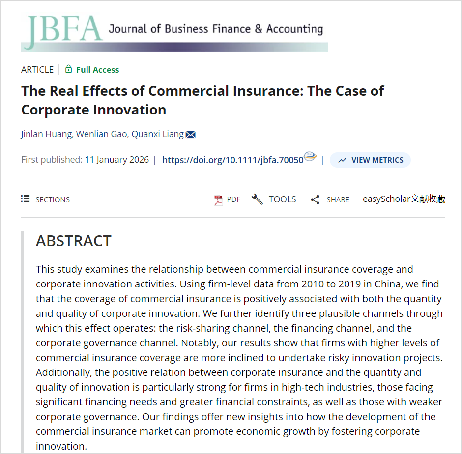 近日,以公司博士研究生黄锦兰为第一作者、梁权熙教授为通讯作者,与美国北伊利诺伊大学Wenlian Gao教授合作的学术论文The Real Effects of Commercial Insurance: The Case of Corporate Innovation被财经类国际权威期刊Journal of Business Finance & Accounting接受发表。