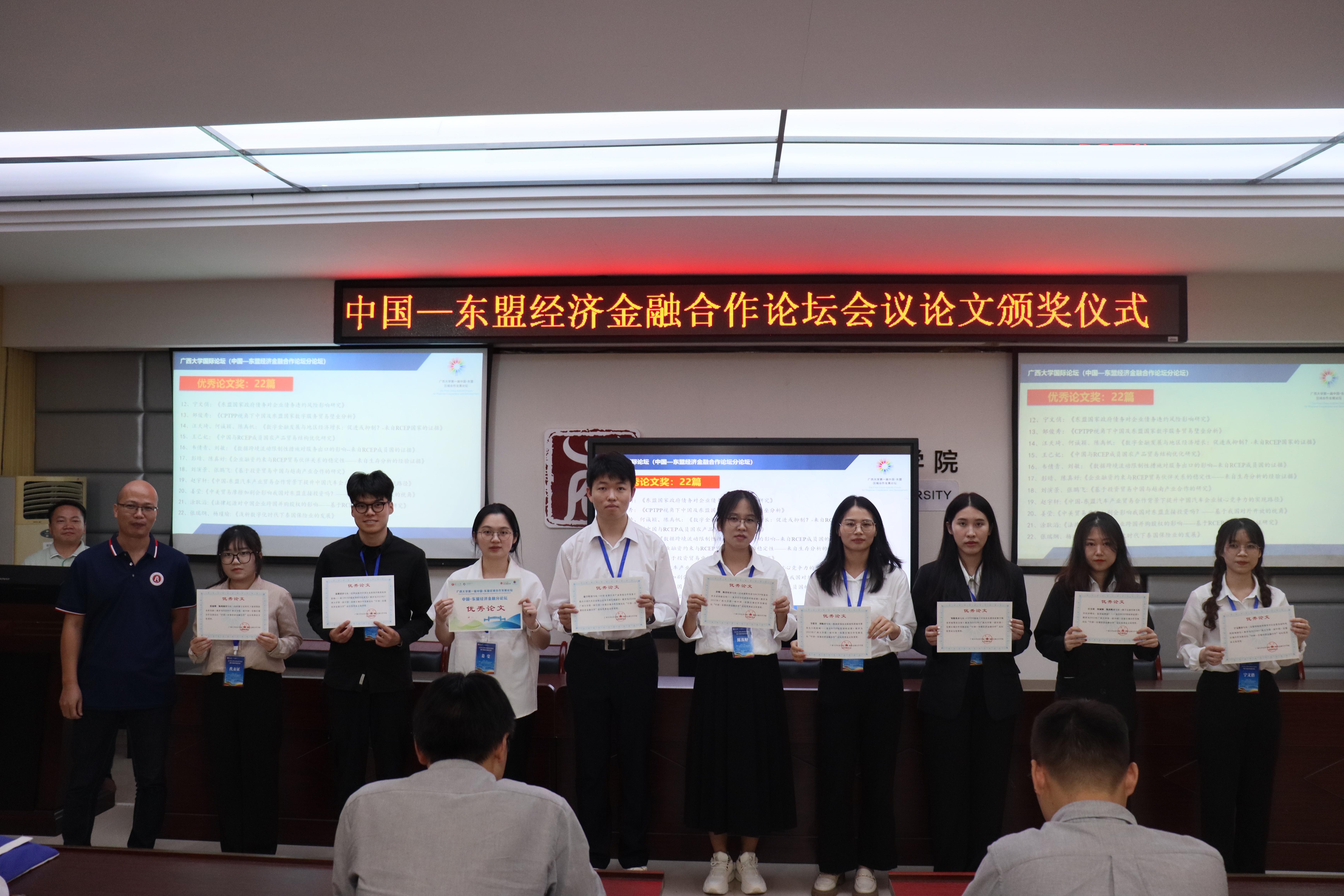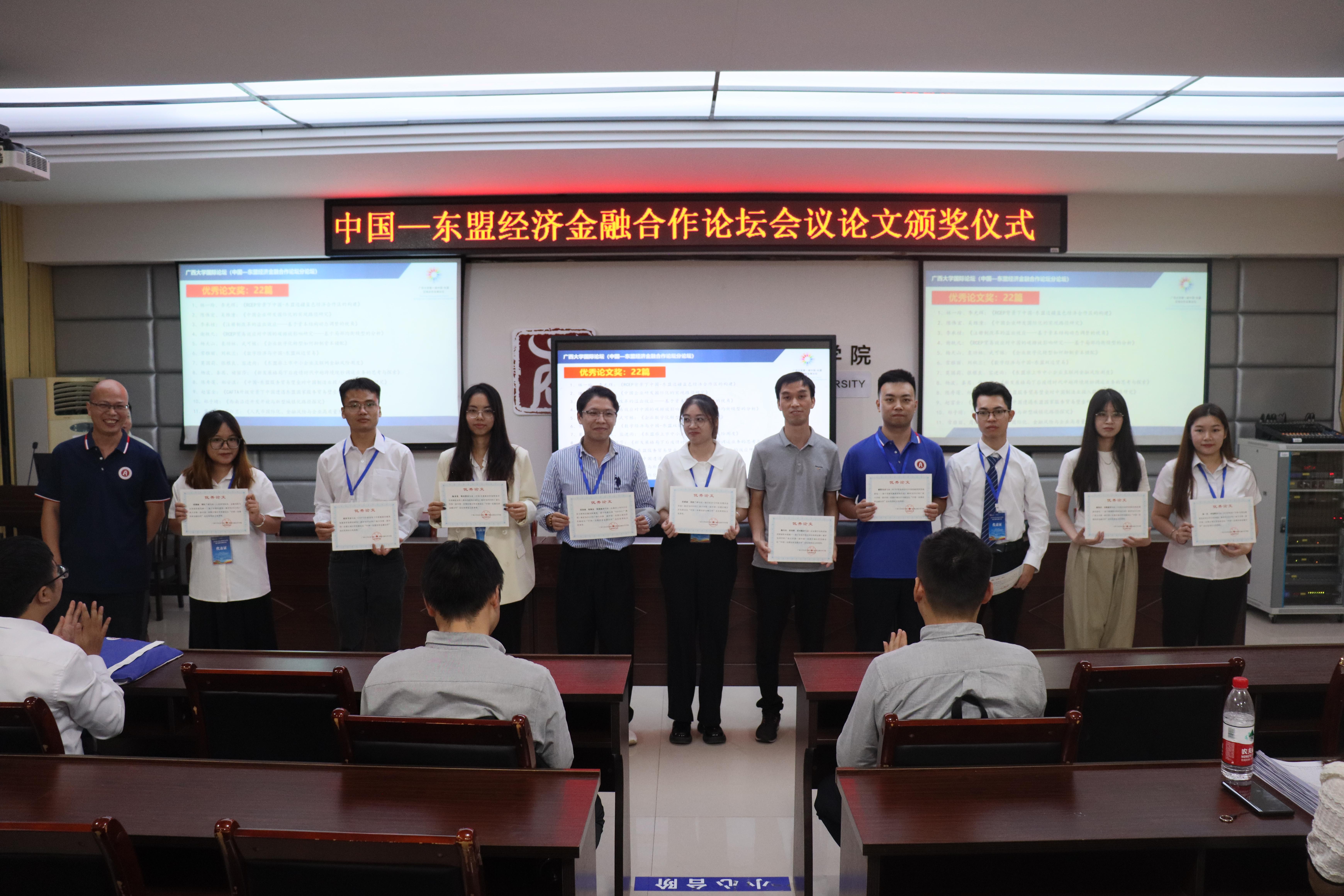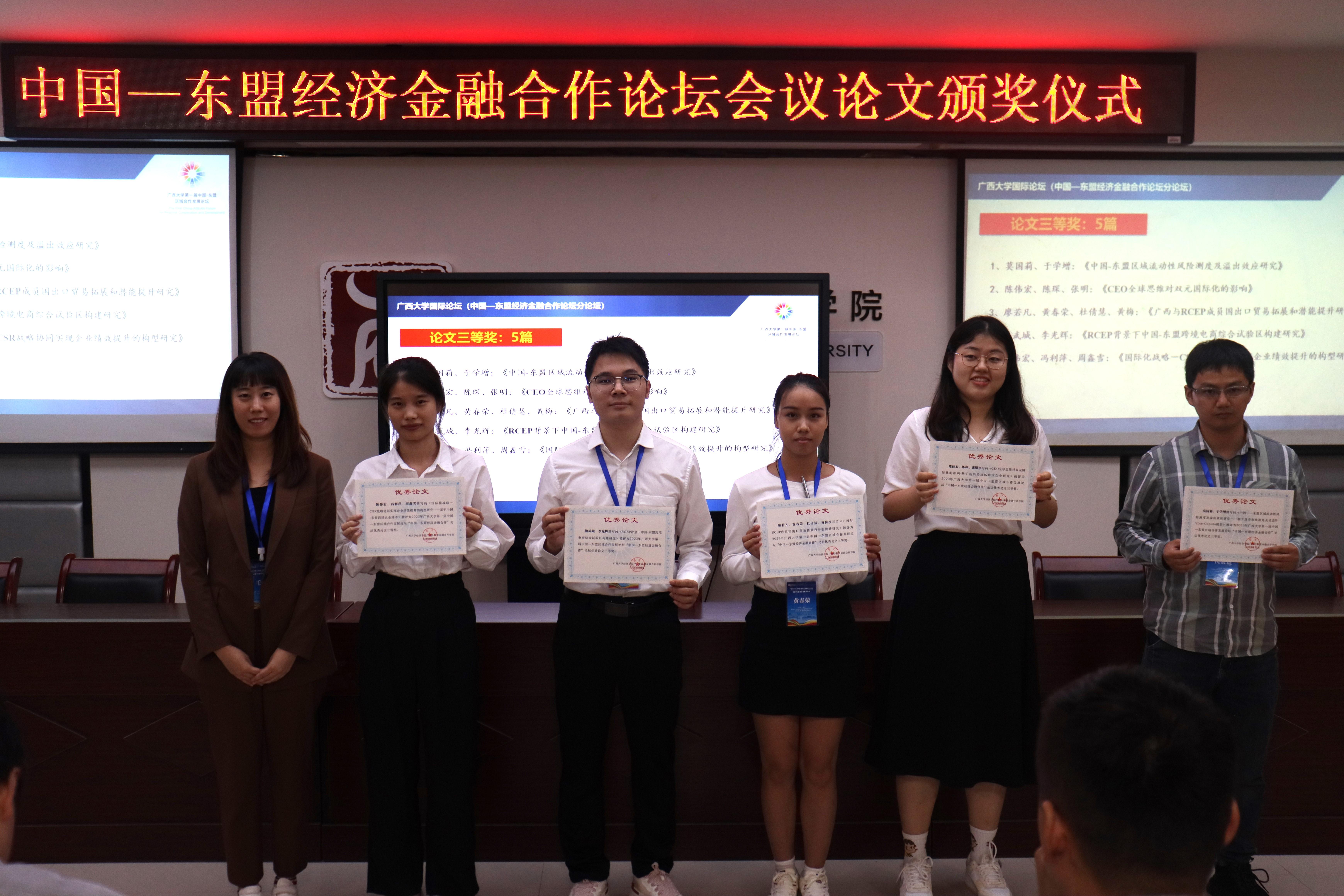 本次论坛的征文得到了来自区内外高校师生的积极响应。15日下午,论坛举办“自贸区与服务贸易”“国际贸易与投资”“金融发展与合作”三个学术平行论坛,从会议投稿中选取了《东盟国家新能源政策的就业效应研究》等34篇优秀论文,进行宣读和专家点评。最后,在MBA大楼124报告厅举行了隆重的优秀论文颁奖仪式,由金融财政支部书记陈新建主持,公司副经理梁权熙,经理助理刘骞文、毛薇及金融系主任谢军为获奖论文作者颁奖。