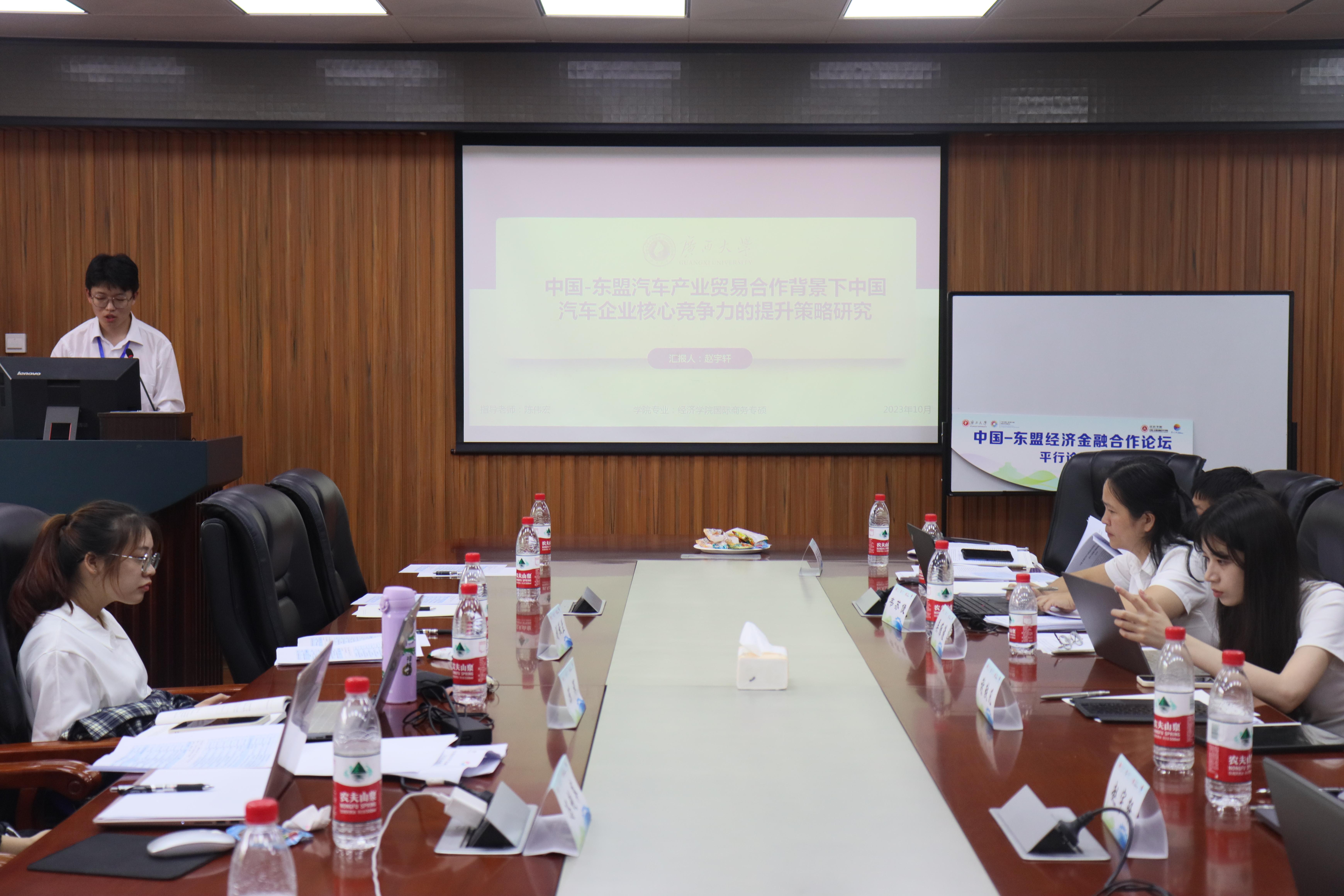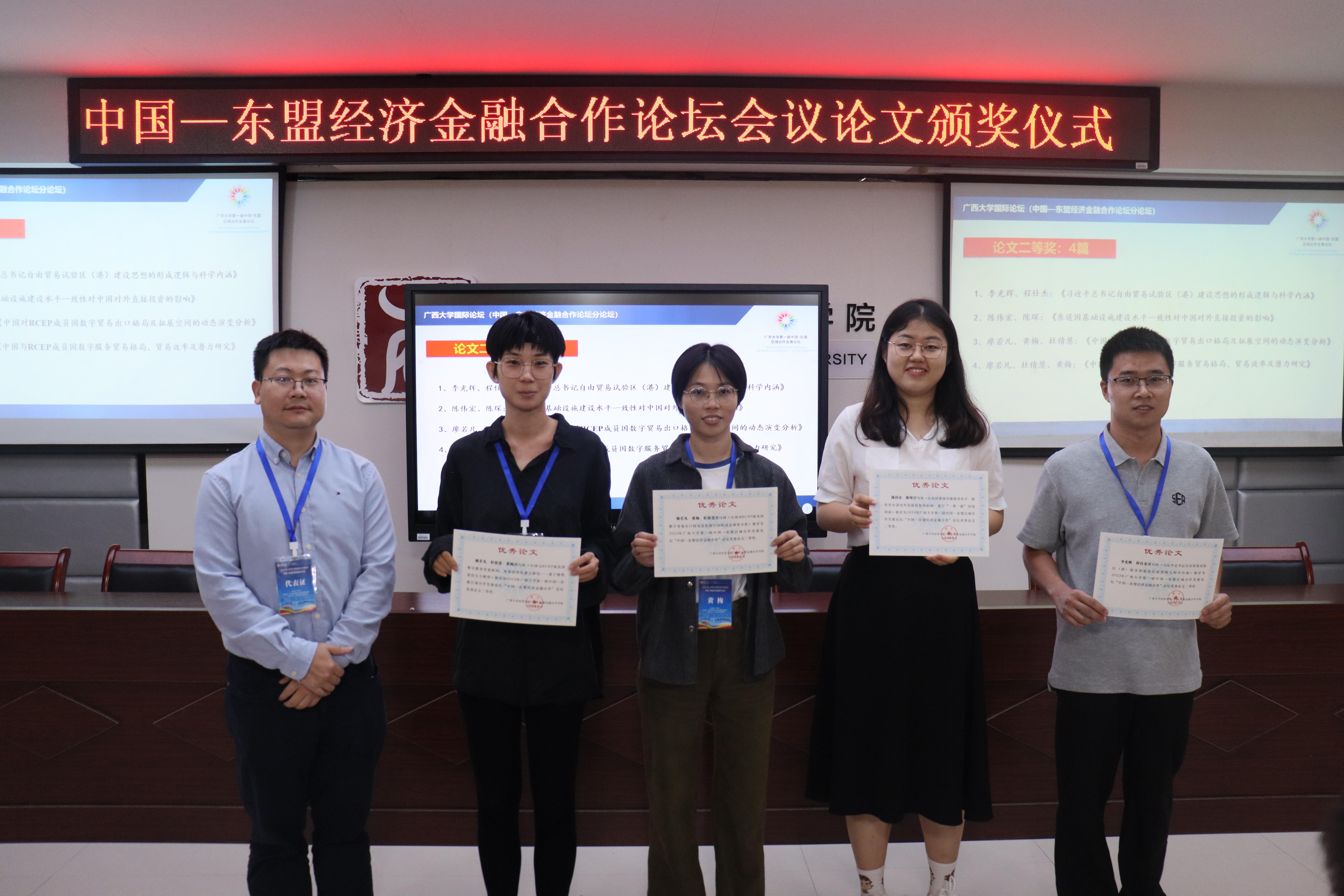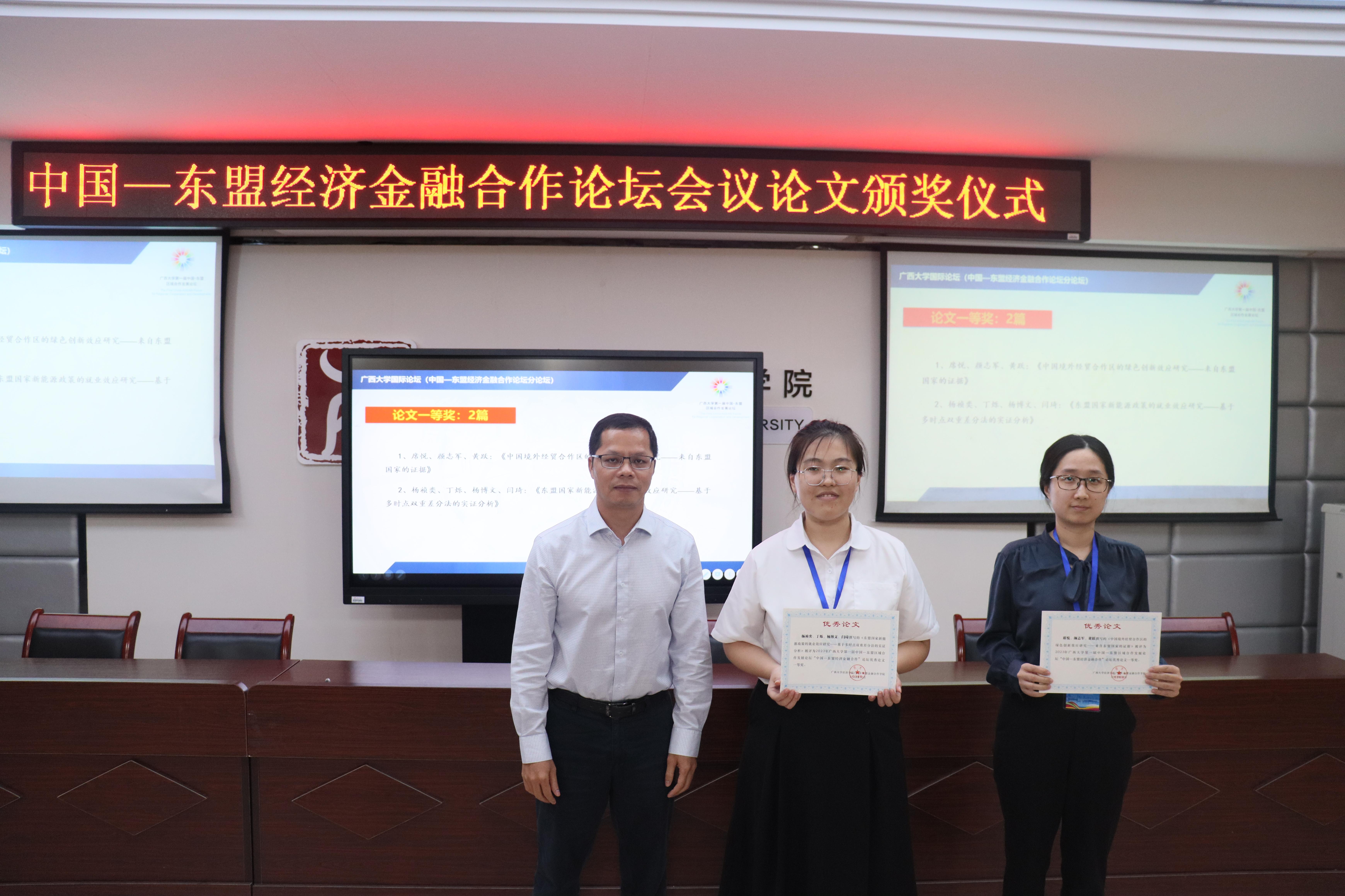 本次论坛的征文得到了来自区内外高校师生的积极响应。15日下午,论坛举办“自贸区与服务贸易”“国际贸易与投资”“金融发展与合作”三个学术平行论坛,从会议投稿中选取了《东盟国家新能源政策的就业效应研究》等34篇优秀论文,进行宣读和专家点评。最后,在MBA大楼124报告厅举行了隆重的优秀论文颁奖仪式,由金融财政支部书记陈新建主持,公司副经理梁权熙,经理助理刘骞文、毛薇及金融系主任谢军为获奖论文作者颁奖。