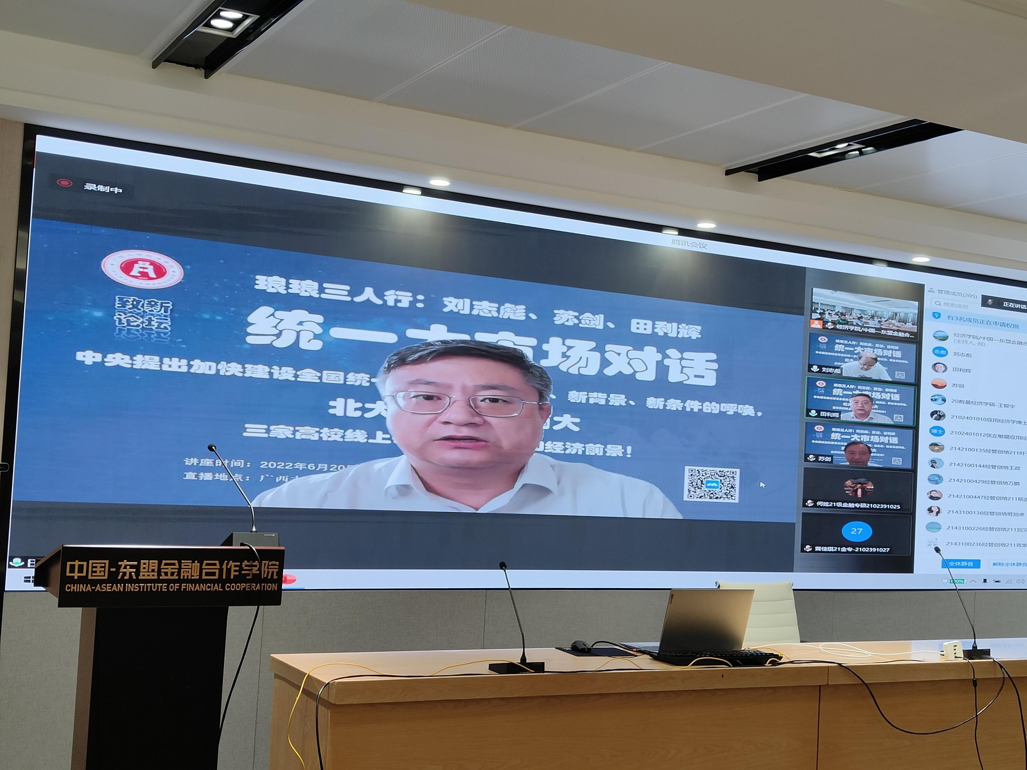 6月20日下午,公司举办“致新论坛”——“琅琅三人行:统一大市场对话”研讨会,论坛由公司党委常委、副董事长田利辉教授主持,邀请南京大学长江产业经济研究院理事长、经理刘志彪教授和北京大学国民经济研究中心苏剑教授等知名经济学家共同畅谈全国统一大市场的政策走向和经济前景,服务广西地方经济发展。公司师生及广西多家媒体以线上线下结合的方式参与互动研讨。