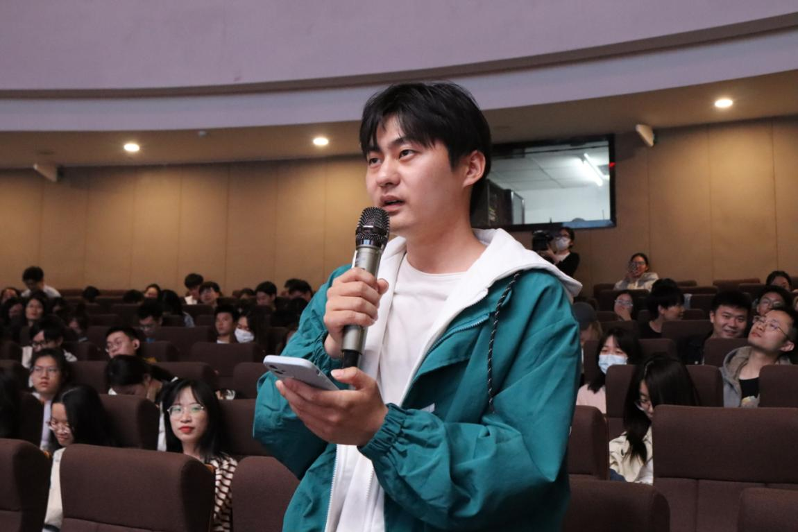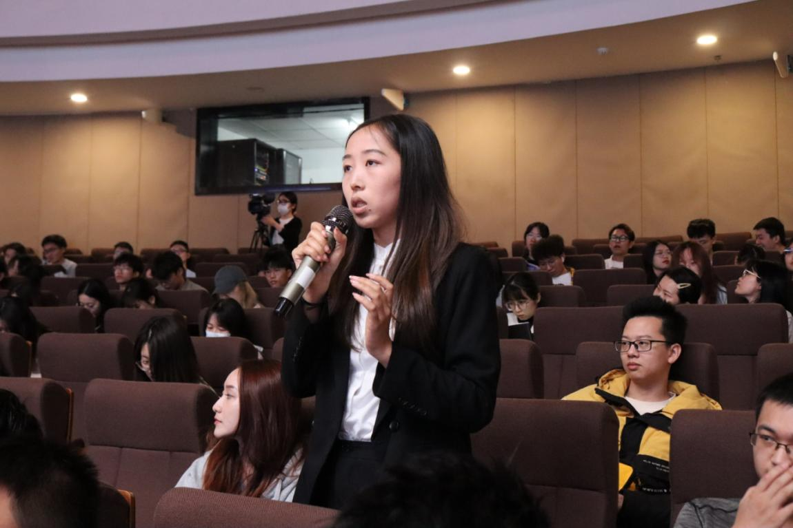 七位金融青年的生动分享引发了同学们的深切思考与共鸣。为了让廉洁教育既打预防针,告诉同学们什么不能做,也打强心针,告诉同学们什么应该做,畅聊会设置了互动交流环节。同学们结合各自关切的一些热点话题大胆求问,既有毕业论文、各类考试考证等学业压力,又有职业生涯发展规划上的一些迷茫;既有对金融行业专业能力、综合素质要求高的担忧,又有结合自身个性如何快速适应银行、保险工作岗位的焦虑;既有对人工智能、ChatGPT在金融行业应用等热点的关注,又有对当前金融监管体制改革的关切。围绕青年学子们关心的话题,与会嘉宾以知心大朋友和学长学姐的身份与同学们进行了深入坦诚的交流。有的以年轻人喜闻乐见的脱口秀、追剧弹幕等小切口拉进彼此距离,共同研判后疫情时代年轻人容易出现的迷茫、焦虑与困惑;有的围绕党的二十大报告中“加强和完善现代金融监管”宣介金融监管体制改革的重要意义;有的以学霸身份分享学习考证心得体会;有的从专业角度指导如何做好步入金融行业的准备;有的以切身经历分享如何从一名职场新手成长为业务骨干,帮助同学们理清思路、建立信心、勇毅前行。台下学子积极发问,台上嘉宾踊跃回应,领导讲、干部讲、老师讲、员工讲,现场互动气氛热烈。对年轻人的思想教育和引领,也在这一问一答、你一言我一语中潜移默化、润物无声。