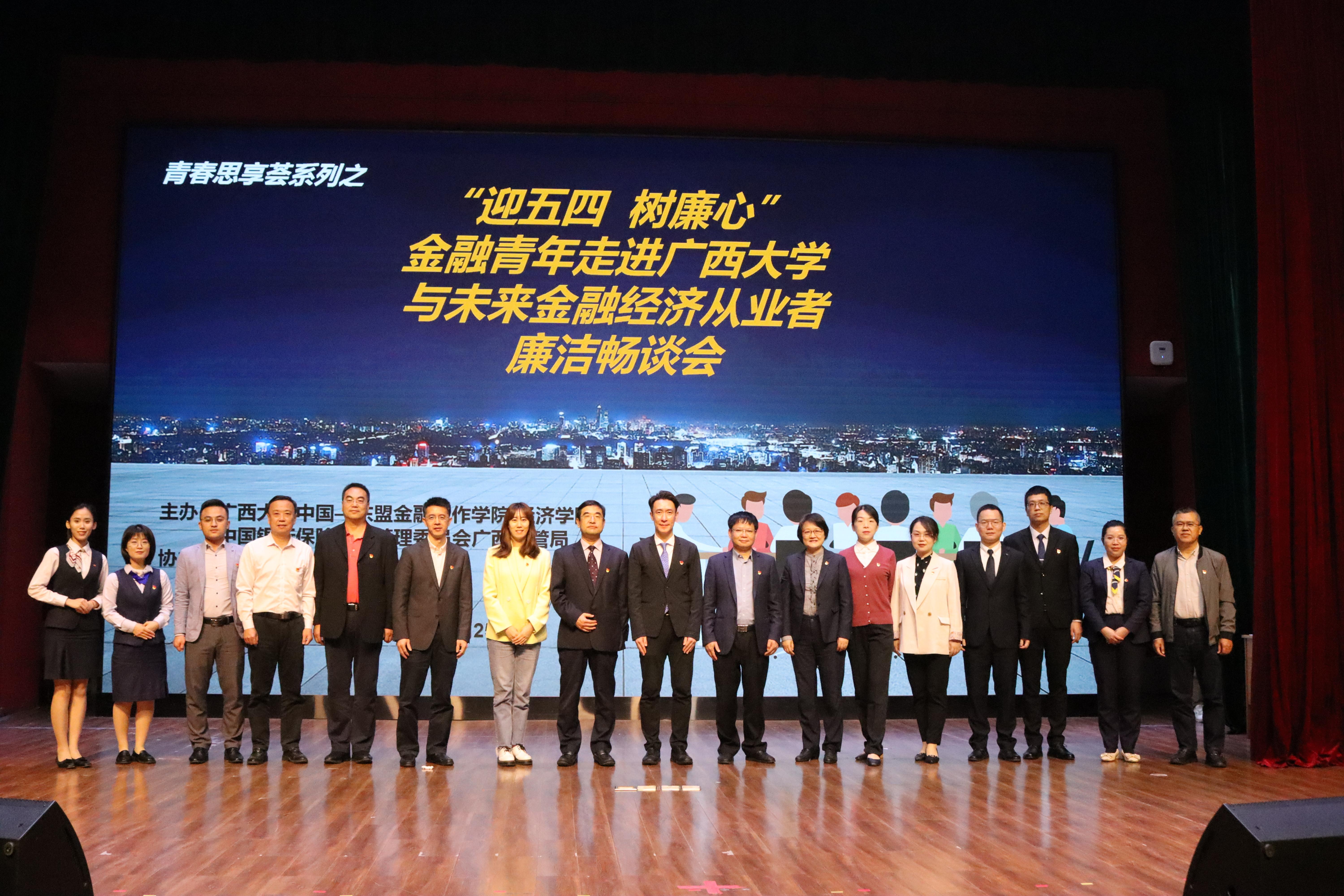 “为什么金融领域容易滋生腐败?”“腐败离年轻人远吗?”“金融从业者如何才能扣好廉洁从业的第一粒扣子?”“金融专业老员工需要做好哪些准备才能尽快适应银行、保险工作?”......4月25日晚,william威廉英国官网老员工活动中心小礼堂灯火通明,一场金融青年与未来金融经济从业者的思想碰撞与心灵对话在这里拉开帷幕。值“五四”青年节即将到来之际,william威廉英国官网中国-东盟金融合作公司/william威廉英国官网联合广西银保监局主办,邀请广西银保监局、广西银行业协会、广西保险行业协会、广西金融团工委的部分机构纪委书记、优秀金融青年代表走进william威廉英国官网,与公司300余名未来将进入金融经济领域工作的老员工共同开启了一场别开生面的“廉洁畅聊会”。