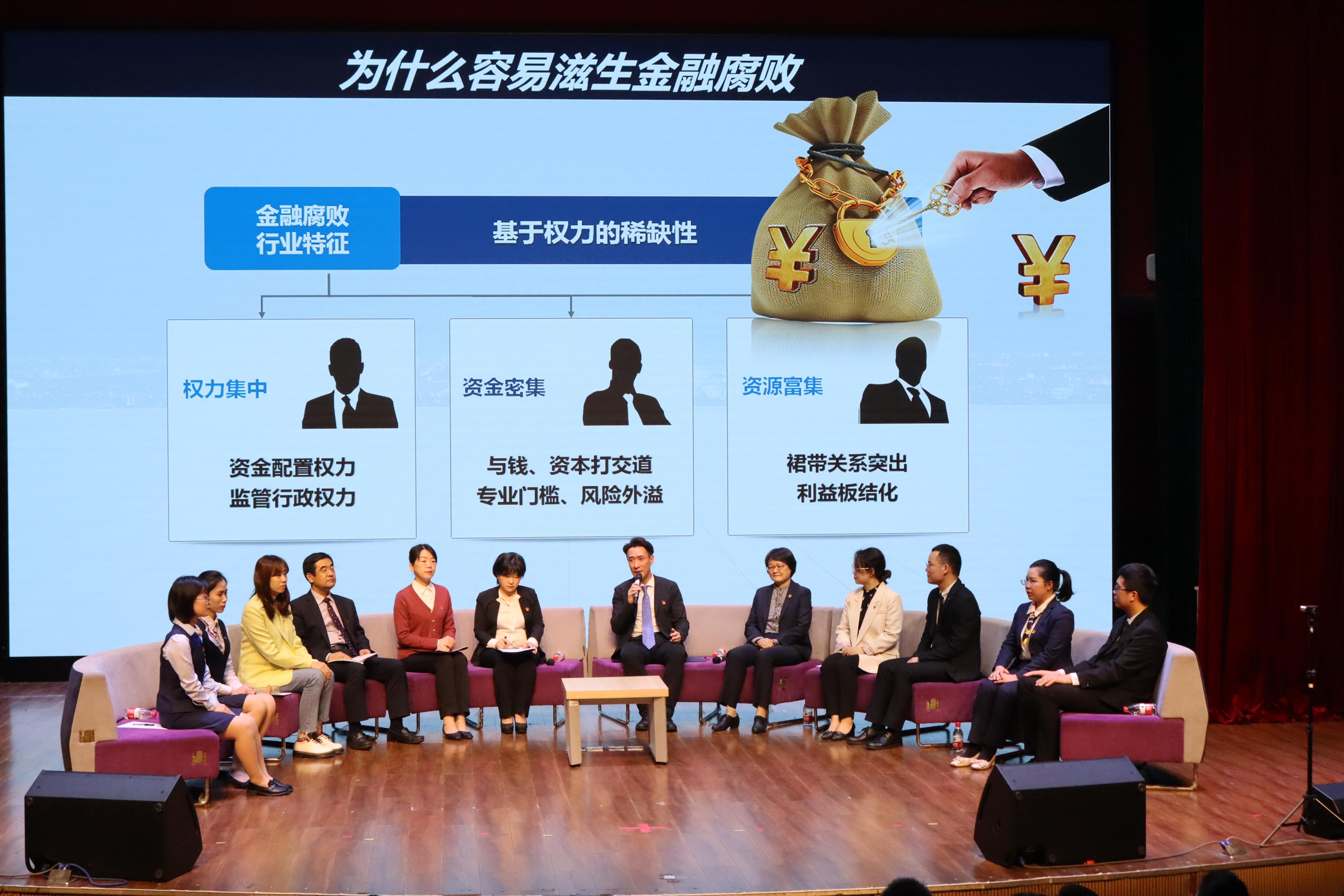 针对当前社会广为关注的金融领域反腐败热点问题,广西银保监局党委委员、纪委书记杨波,招商银行南宁分行副行长、纪委书记楚建忠,国富人寿纪委书记黄鹏为同学们作了专题解析。从权力稀缺性的角度切入,分析金融领域资金交易腐败和监管腐败机理,通过一些鲜活案例引导同学们深刻认识金融腐败危害及严峻形势;从一体推进“三不腐”基础性工程的高度,帮助同学们深刻理解为什么要开展清廉金融文化建设,同学们在其中需要做什么;从当前年轻干部贪腐问题“低龄、小权、巨贪、炫技”特征,告诫同学们腐败离年轻人并不遥远,年轻有为绝不能等同于“年轻妄为”;从坚决破除“金融精英论”里所谓“精英”的腐化蜕变,引领同学们前瞻警醒,提前接种“反腐疫苗”,自觉把金融工作政治性与人民性置于专业性之上,勇做忠诚于党和人民的金融生力军。