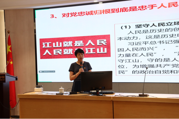 潘莹副经理围绕新时代对党忠诚的精神实质、实践要求和如何践行对党忠诚这三个主题细致地展开专题党课,激励党员同志们坚定理想信念、对党绝对忠诚。她敦促大家按照习近平总书记的要求,把“对党忠诚,必须一心一意、一以贯之,必须表里如一、知行合一,任何时候任何情况下都不改其心、不移其志、不毁其节”贯彻进自身思想行为的方方面面,力争做到“一个党员就是一面旗帜”。专题党课结束后,与会党员们展开热烈交流和讨论。