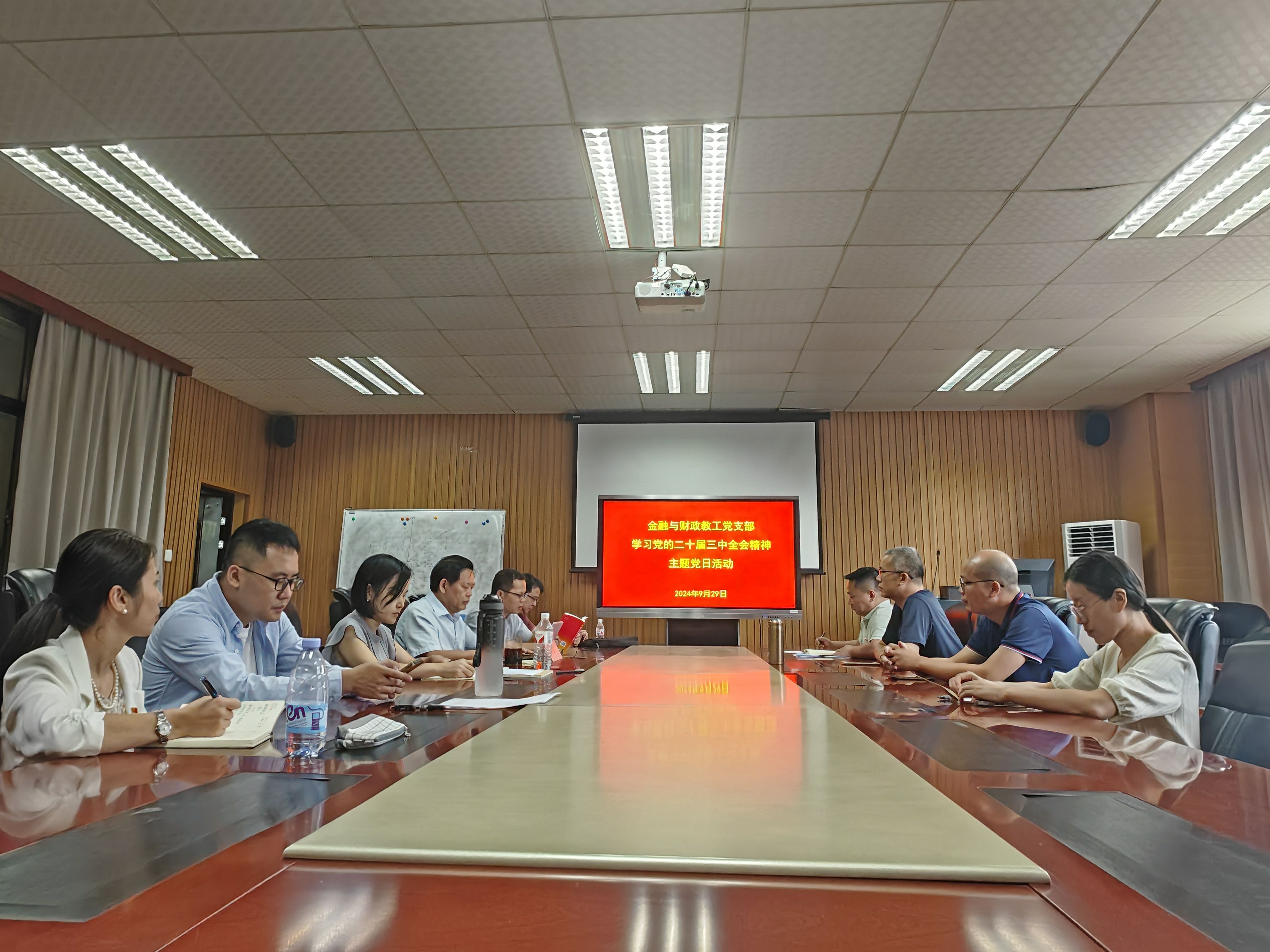 2024年9月29日,“双带头人”教工金融与财政党支部组织召开“学习贯彻党的二十届三中全会精神”主题党日活动,深入学习党的二十届三中全会精神和习近平总书记近期重要讲话精神。学习活动由支部书记陈新建主持。