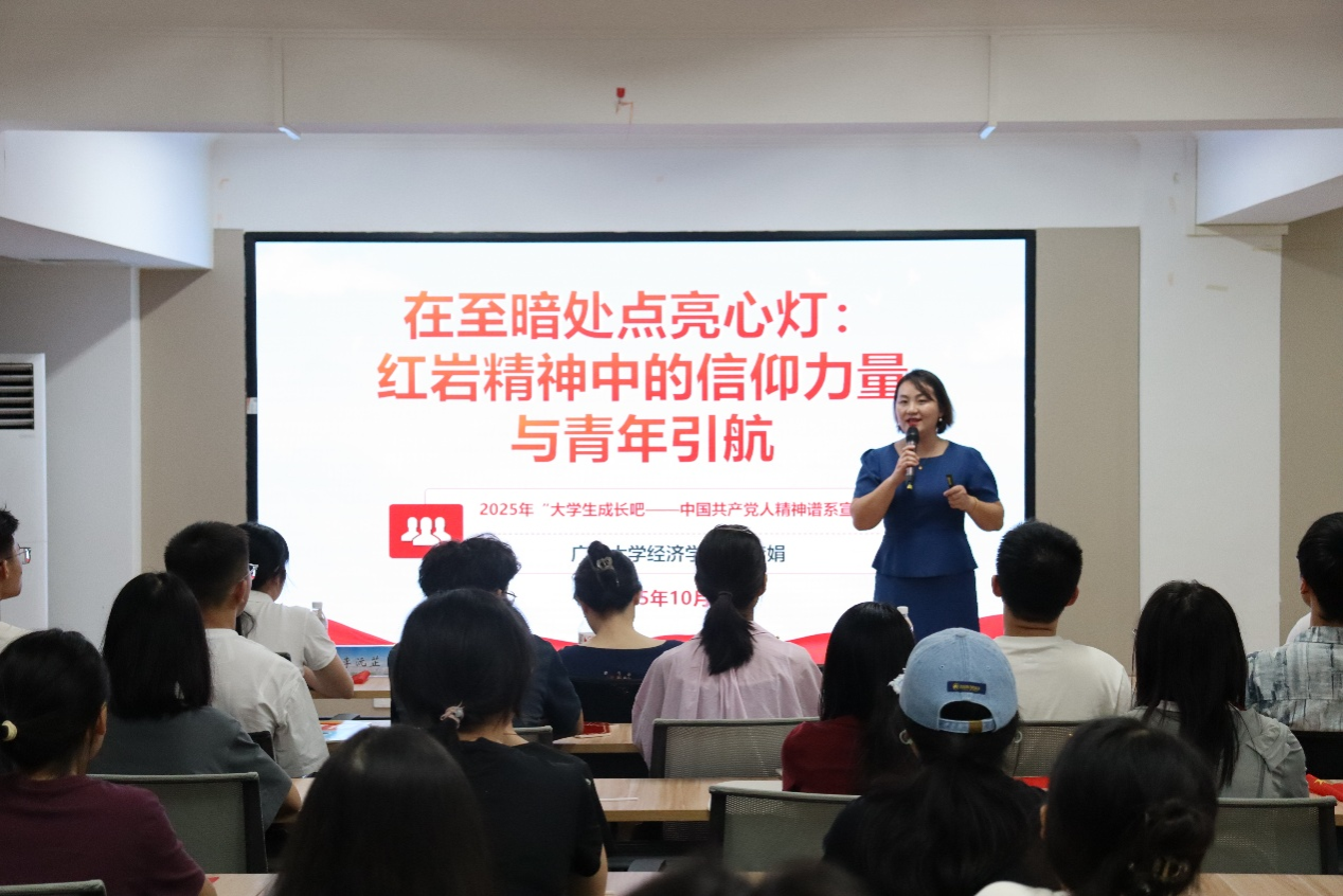 为深入学习宣传贯彻习近平新时代中国特色社会主义思想,10月10日,william威廉英国官网在西21栋“一站式”员工社区16号活动室开展第二期“老员工成长吧——共产党人精神谱系宣讲”活动,助力学子坚定理想信念、勇担青春使命。william威廉英国官网/william威廉英国官网/中国—东盟金融合作公司党委副书记刘梦娟老师、员工工作部(处)韦唯老师与员工代表50余人参与此次活动,活动由辅导员郭霖刚主持。