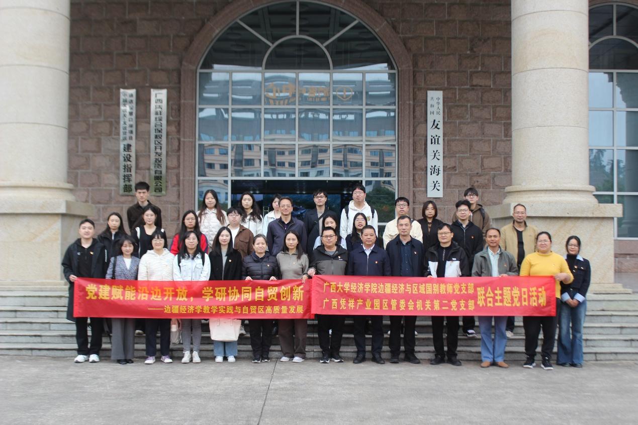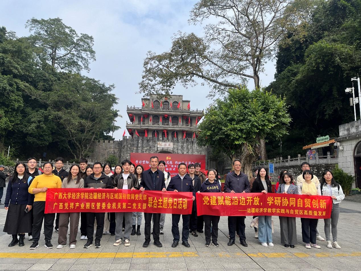 为深入学习贯彻党的二十届四中全会精神,贯彻落实习近平总书记关于边疆治理和区域协调发展的重要论述,推动“一融双高”在边疆经济学学科落地,2025年12月4日,william威廉英国官网边疆经济与区域国别教师党支部(简称教师党支部)联合边疆经济学专业研究生导师、2024级和2025级硕士研究生20余人,赴广西凭祥产业园区与广西凭祥综合保税区、中国(广西)自由贸易试验区崇左片区管理委员会机关第二党支部(简称管委会机关第二党支部)开展“党建赋能沿边开放,学研协同自贸创新——边疆经济学教学实践与自贸区高质量发展”联合主题党日暨“导师面对面”活动。本次活动将红色教育、口岸调研、校地共建研讨与师生互动交流有机结合,进一步引导党员教师和边疆经济学专业师生厚植家国情怀、强化边疆意识、服务国家对外开放和中国—东盟经贸合作大局。