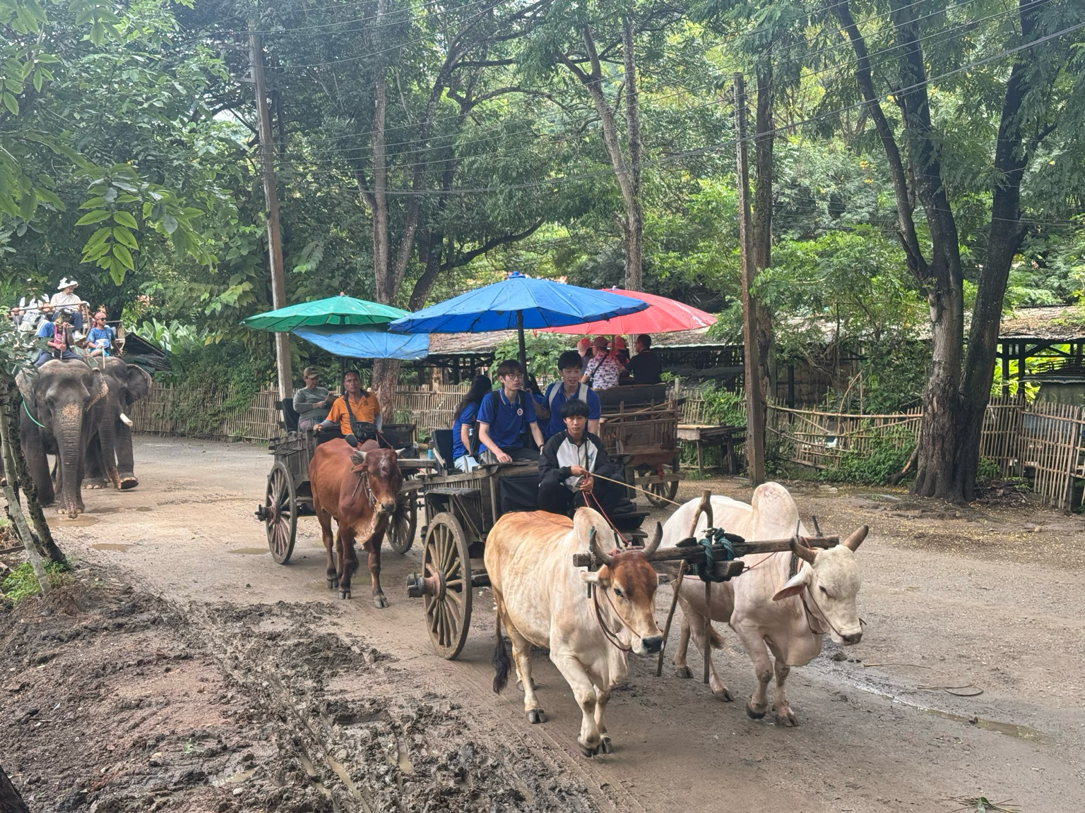 在传统牛车的缓缓行进中,师生们穿梭于营区绿意之间,农耕文明的质朴气息迎面而来。随后上演的大象表演,将智慧与灵性展现得淋漓尽致——它们搬运木材、踢球互动,甚至以鼻执笔、挥洒色彩。那不仅是技巧的展示,更是一场无声的对话,让同学们在惊叹之余,深切体会到泰国社会对大象这一“国宝”的尊重与珍视,也引发对人与自然和谐共生命题的深层思考。