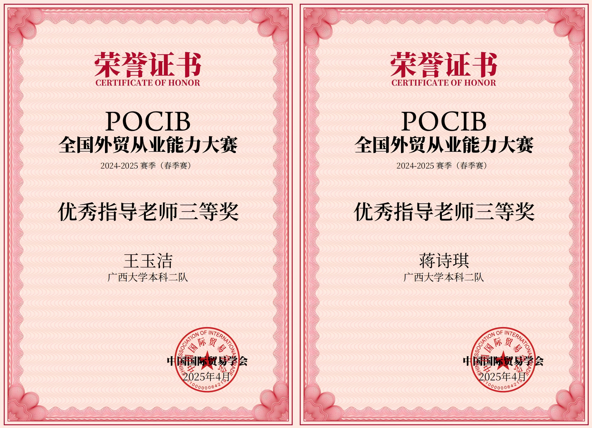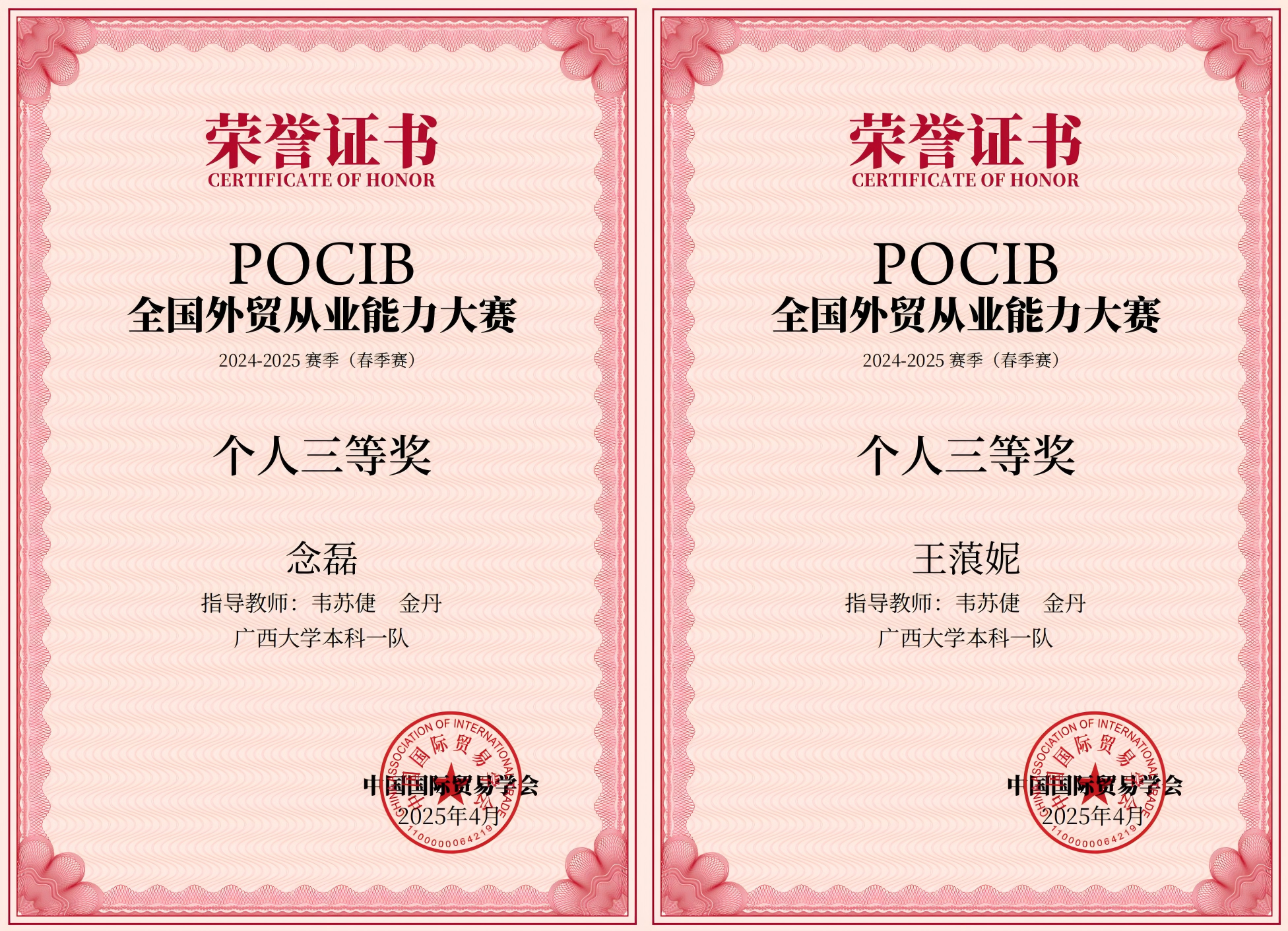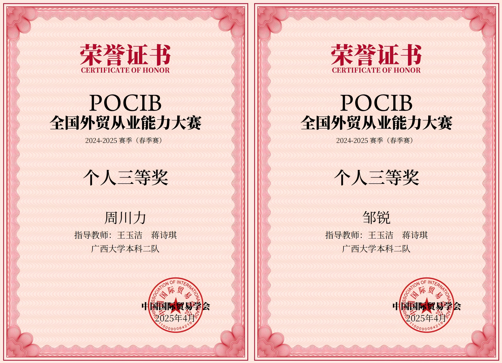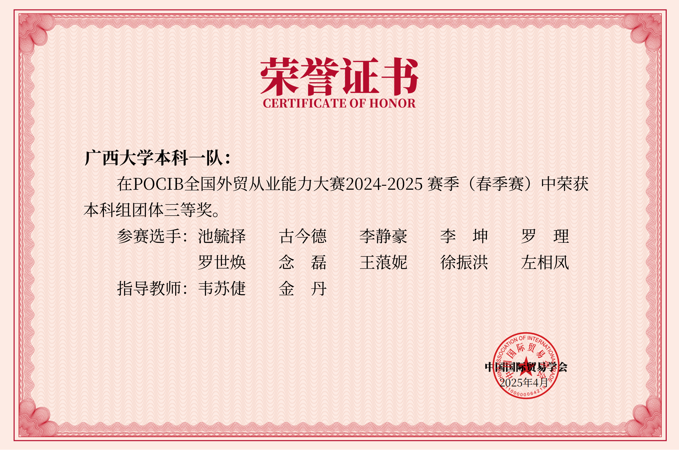 由中国国际贸易学会主办的第十四届POCIB全国外贸从业能力大赛(春季赛)于2025年4月19日上午落下帷幕,本届大赛共有来自 250 所院校的818支队伍、共计8180名选手参赛。公司参赛队伍经过13天的紧张比赛和不懈努力,最终在818支队伍中脱颖而出,荣获2项团体三等奖,并斩获参赛选手个人二等奖2项,个人三等奖14项,优秀指导老师三等奖4项。