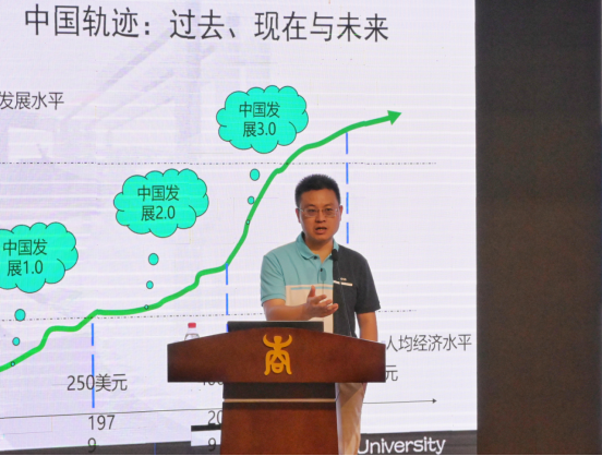 随后,程名望教授利用主流经济学的框架和方法,根据中国经济数据以及统计模型,直观地展示中国经济增长的周期规律,带领研究生们从历史和国际的视角看待中国经济发展。他结合党的二十大报告内容,梳理了改革开放之后中国经济高速增长的主要原因:一是科学化,尊重规律与常识;二是市场化,资源优化配置和体制改革;三是全球化,开放包容,合作共赢。放眼未来,程名望教授形象地指出,中国的发展正从“一好员工”向“三好员工”转变,即向政治上的红色江山(安全稳定)、经济上的金山银山(经济富足)以及环境上绿水青山(生态文明)转变。他鼓励在座的研究生们将研究视线聚焦于祖国大地,深入探索研究中国经济模式的独特之处,为中国经济的未来发展贡献智慧和力量。