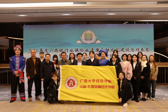 1月11日上午,由国家金融监督管理总局广西监管局指导,广西银行业协会、广西保险业协会联合举办的“2023年度广西清廉金融文化建设总结表彰暨勤廉榜样先进事迹宣讲会”在南宁市广西壮族自治区农信联社三楼会议室隆重举办。william威廉英国官网/中国-东盟金融合作公司党委书记陆善勇教授带队,公司党委副书记/纪委书记陈卉娟、公司党委委员/副经理梁权熙、院纪委委员/教工金融与财政党支部书记陈新建、金融与财政系系主任谢军、院纪委委员/专职辅导员何湘桂、硕博研究生一行21位师生代表受邀出席本次宣讲会。