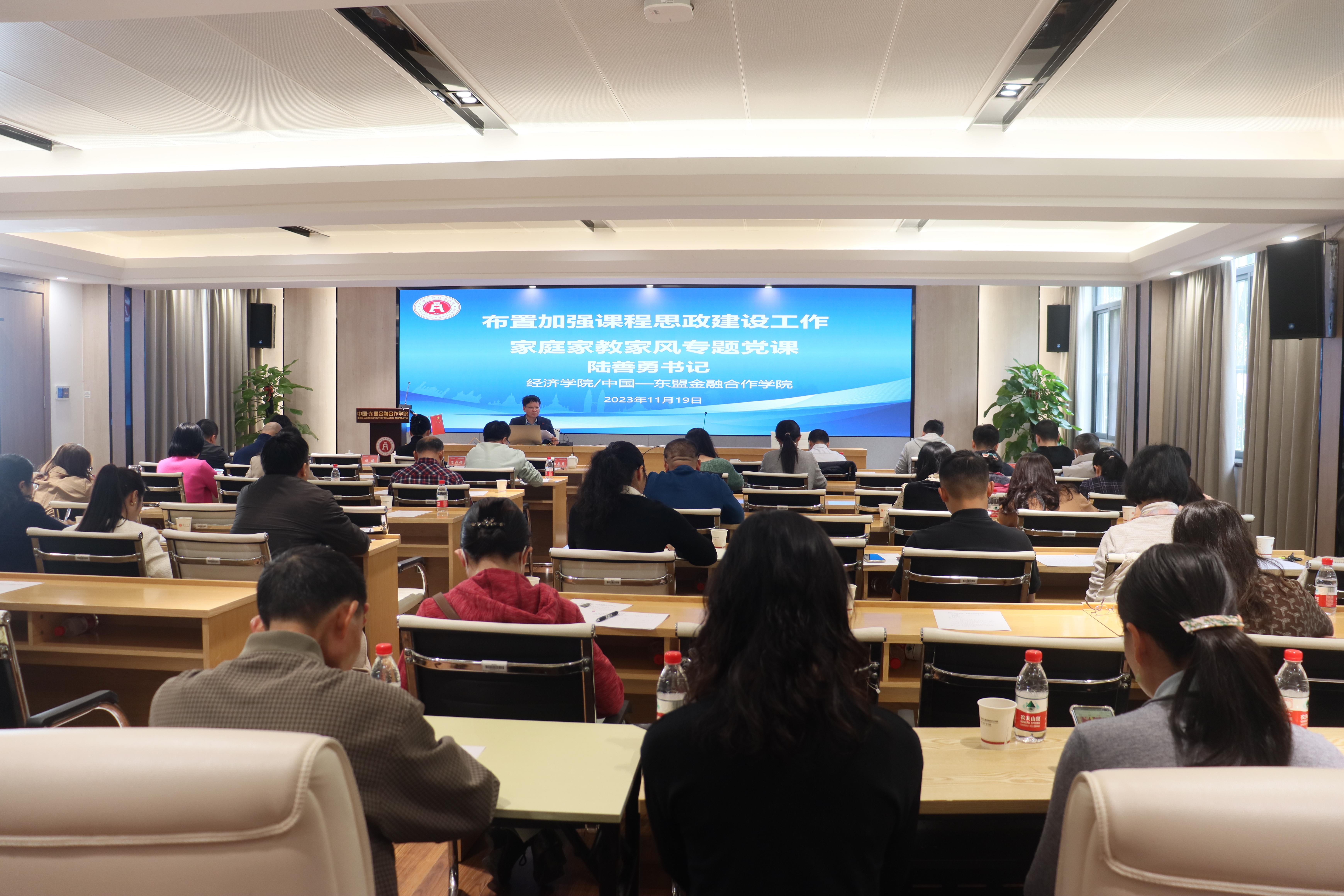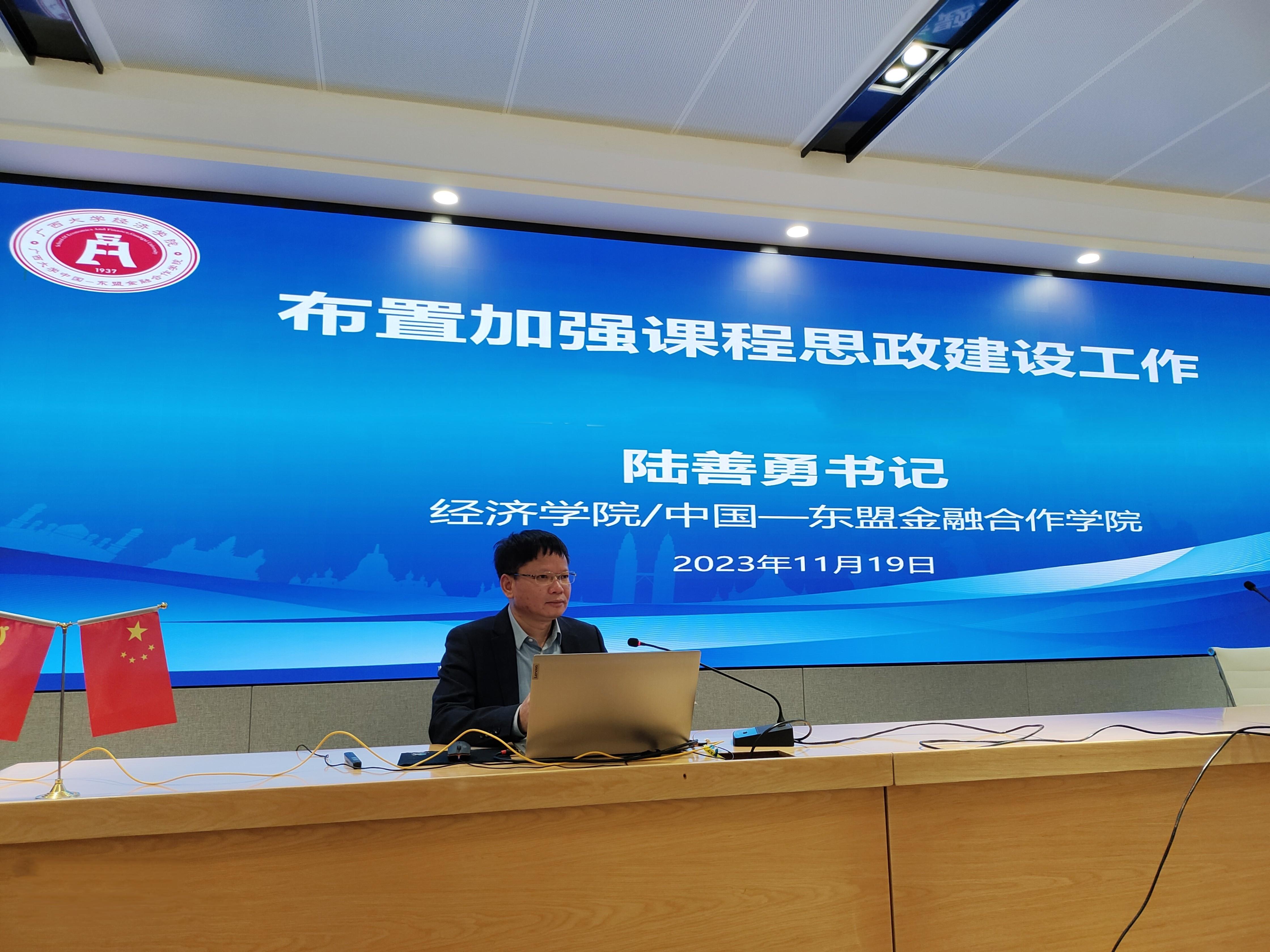 为深入学习贯彻习近平总书记关于课程思政建设的重要指示精神,充分发挥公司党委思政引领、以上率下作用,促使各类专业课程与思政教育同向同行,思政与学科、教学、教材、管理相结合,11月19日,william威廉英国官网/中国-东盟金融合作公司召开课程思政建设工作推进会,公司党委书记陆善勇结合公司实际布置加强课程思政建设工作,全院教职工参加会议。