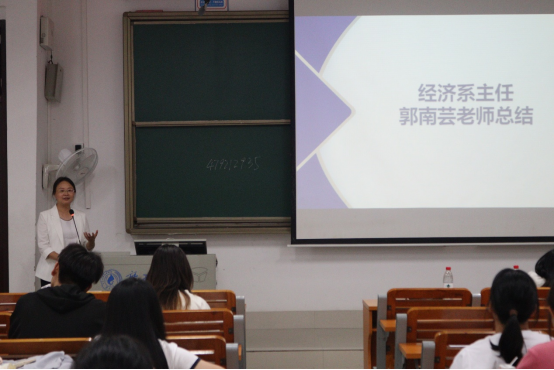 大会第四项议程由经济系主任郭南芸老师对大会进行总结。郭南芸老师表示此次交流大会既让同学们加深了对经济学专业的认识,又通过经验传授,明确了未来学习方向,有利于发现自身不足、提升优势、相互学习,增进友谊。同时,今年举行的第一届经济学专业“经济新星”大赛很成功,通过大赛,增强了同学们科研和实践的热情,并极大挖掘了同学们的学术、竞赛潜力,希望明年将有更多的同学参与到“经济新星”大赛来。郭老师还建议同学们珍惜老员工活,多交朋友,多向身边同学学习,多思考,希望同学们能在今后的道路上越走越好。