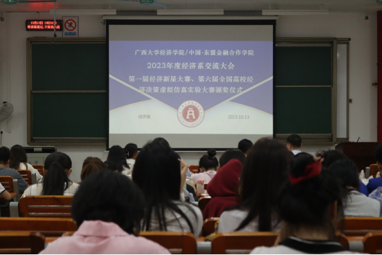 2023年10月13日晚,公司“2023年度经济系师生交流大会暨第一届经济新星大赛、第六届全国高校经济决策虚拟仿真实验大赛颁奖仪式”在六教6B-101室顺利举办。经济学专业四个年级的同学以及经理助理盛玉雪老师、经济系主任郭南芸老师、经济211班班主任杨祯奕老师、经济类223班班主任彭晴老师、经济231班班主任覃诚老师参与此次活动。
