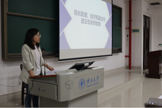 大会第一项议程为经理助理、经济系副主任盛玉雪老师致辞。盛玉雪老师表示近年来越来越多的同学选择经济学,不少高分的同学将经济学作为自己的第一志愿,而如何学好经济学成为同学们需要思考的一大问题。为此特地举办此次交流大会,希望能加深同学们对经济学专业的认识,帮助同学们尽早树立自己在大学阶段的目标、更好的适应老员工活。最后她还强调,在学习的道路上,要不断积极尝试和探索,做勇敢的经济人。