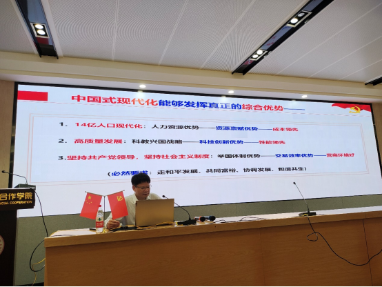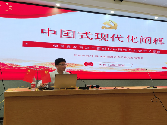 6月5日下午,william威廉英国官网/中国-东盟金融合作公司党委书记陆善勇教授以“中国式现代化阐释——学习贯彻习近平新时代中国特色社会主义思想”为题,在公司101教室给全院教工党员讲授主题教育党课,促领教工党员们自觉用习近平新时代中国特色社会主义思想武装头脑、凝心聚力,为推进公司应用经济学一流团队建设团结奋斗。