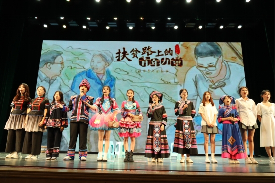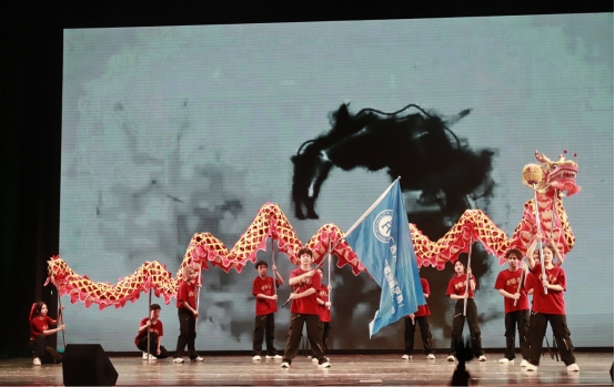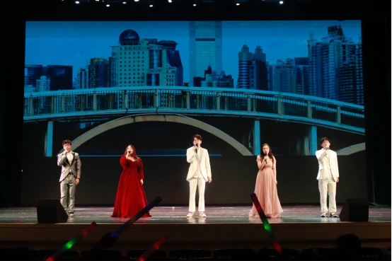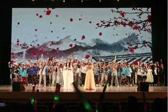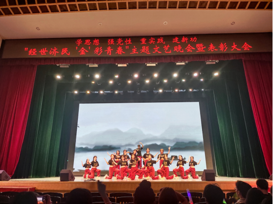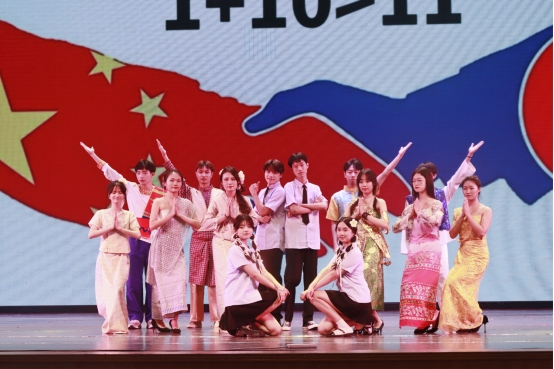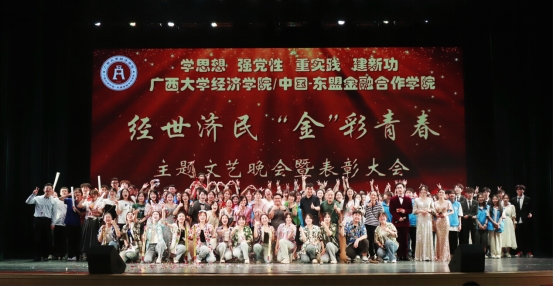第三篇章聚焦于传承弘扬中华优秀文化,体现公司联系东盟、交流互促,青年学子与东盟各国朋友携手同行的特色和优势。舞蹈《青苹果乐园》展现了院级团学组织骨干朝气蓬勃的青春活力,院礼仪模特队带来了让人眼前一亮的走秀表演《多彩东盟》,色彩明丽的民族服饰跃然台前,展现了东盟各国独特的民族风情,最后,歌曲《一路生花》将晚会带入尾声。在悠扬的乐曲和一声声礼炮鸣响中,所有演职工作人员上台谢幕,公司“经世济民 ‘金’彩青春”主题晚会暨表彰大会圆满落下帷幕。