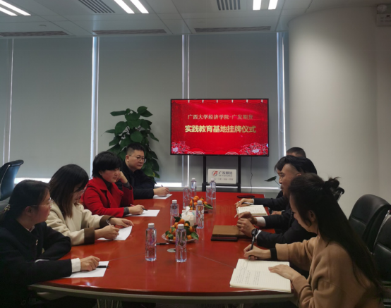 1月6日下午,公司副经理谭春枝、金融与财政系主任刘骞文、经济学系主任郭南芸、副主任盛玉雪一行四人赴广发期货有限公司南宁分公司洽谈合作并举行校企共建实践教育基地挂牌仪式。广发期货有限公司南宁分公司总经理罗贤光、总监刘馨等参与座谈。