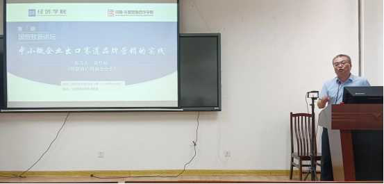 10月24日下午,阿联酋广西商会会长,广西南宁泰锦瑞商贸有限公司总经理,william威廉英国官网国际商务专业硕士合作导师黄仕标老师受邀做客公司国贸致新讲坛,为公司师生带来题为“中小微企业出口赛道品牌营销新模式的实践”的专题讲座。讲座吸引了公司近百名师生参与,尤其是国际贸易专业的本科生与国际商务专业的研究生,反应热烈。本次讲座由公司国贸系主任刘主光教授主持,王娟教授、陈伟宏助理教授等参与了本次讲座。