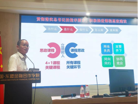 覃安基副部长从习近平总书记在全国高校思想政治工作会议上的重要讲话出发,解读了中央对课程思政建设的决策部署及教育部《高等公司课程思政建设指导纲要》,从“为什么”、“是什么”、“做什么”、“怎么做”、“谁来做”等五个方面对高校教师如何推进课程思政建设,如何将课程思政更好地“融入”专业课教学进行了阐述。最后,覃安基副部长介绍了公司王乃学书记对课程思政建设的重要指示提出的背景和内涵,鼓励教师们通过一个故事、一个案例、一个话题、一次活动等,将课程思政做到“润物无声”。要显性教育与隐形教育相结合,实现思政教育与专业课堂的有机融合。公司的经济、国贸和金融专业课程有天然的优势,都可以很好地融入思政元素,尤其是与中国-东盟合作方面的特色元素。