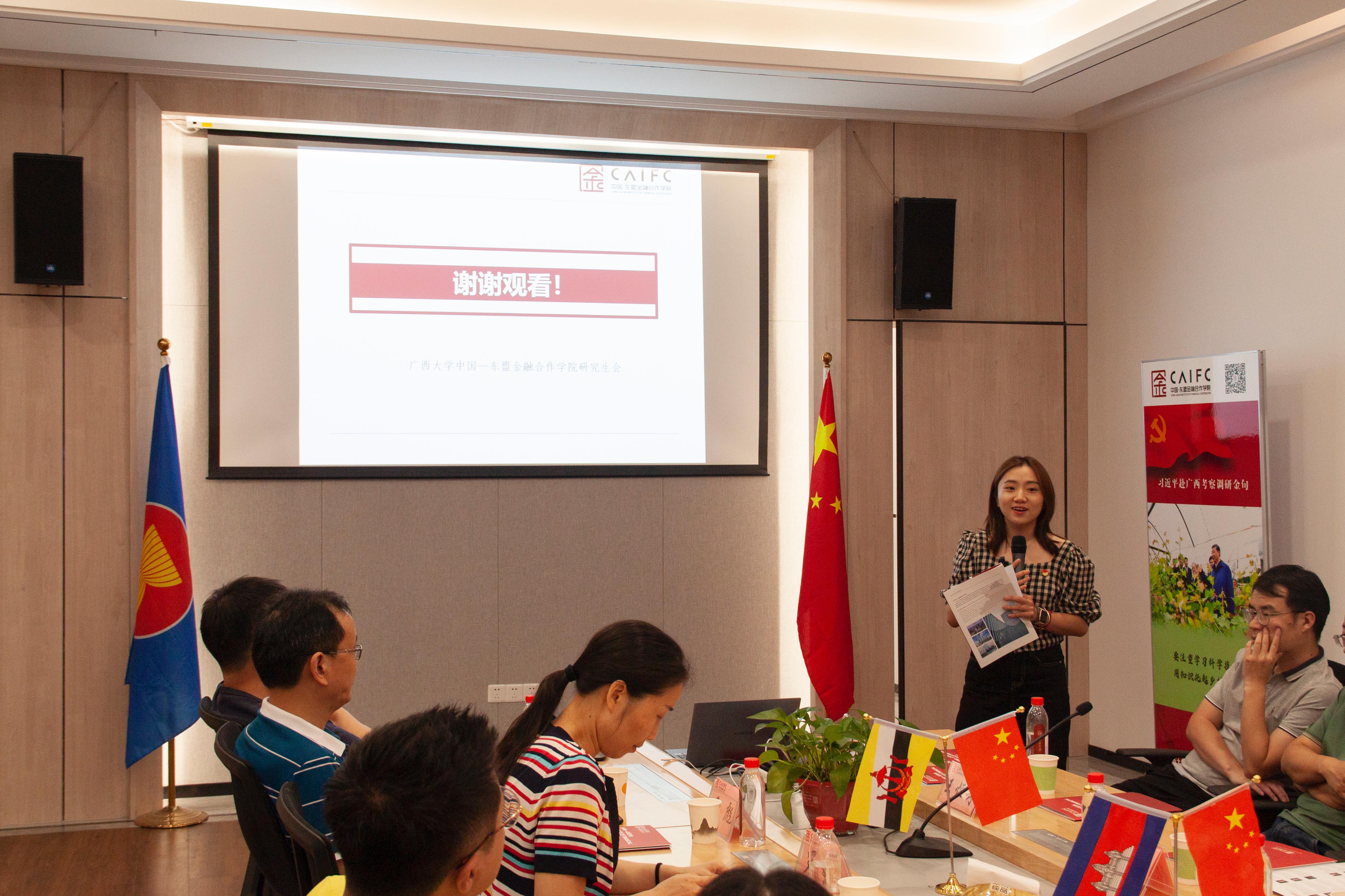 东金院研究生会主席张甜甜依次介绍了公司本学期开展的“走进七彩东盟”小语种培训、越南专题讲座、东盟礼仪课堂等系列东盟文化活动,旨在通过举办东盟文化活动,不断增进文明互鉴,为促进中国与东盟国家的人文交流发挥积极作用。