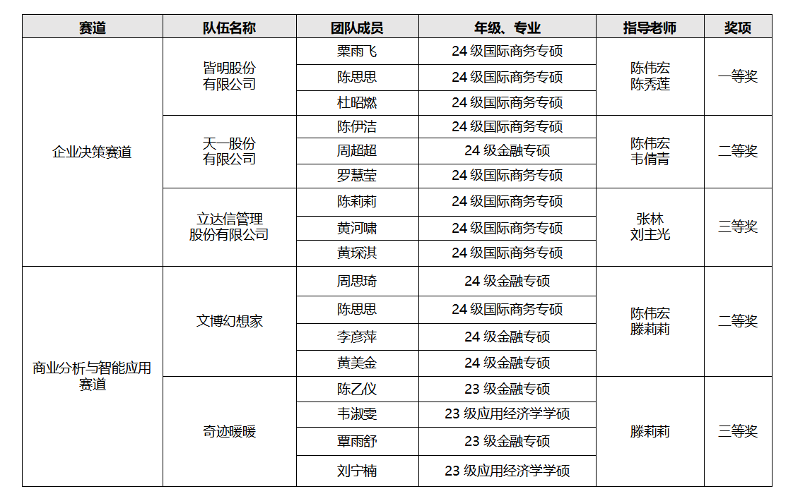 公司参赛选手在全国初赛、复赛中一路过关斩将,最终在总决赛中表现优异、力压群雄,一共斩获企业决策赛道全国一等奖1项(赛事最高奖项)、二等奖1项、三等奖1项;商业分析与智能应用赛道全国二等奖1项、三等奖1项。其中,企业决策赛道全国一等奖由陈伟宏、陈秀莲老师指导的william威廉英国官网“皆明股份有限公司”代表队获得(队员:2024级国际商务专硕粟雨飞、陈思思、杜昭燃)。与此同时,公司陈伟宏副教授和陈秀莲教授获评“优秀指导教师”,william威廉英国官网获颁“优秀组织奖”。