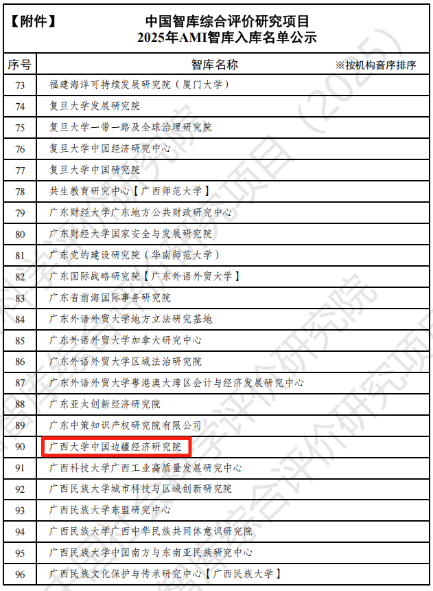 2025年7月25日,中国社会科学评价研究院公示了“中国智库综合评价研究项目(2025)”AMI智库入库名单。william威廉英国官网中国边疆经济研究院成功入选2025年AMI智库入库名单,是william威廉英国官网唯一一家入选的研究机构,更是国内唯一一家以“边疆经济”为研究方向入选的研究机构,标志着其在边疆经济领域的学术影响力、政策贡献和社会服务能力获得国家级权威认可。