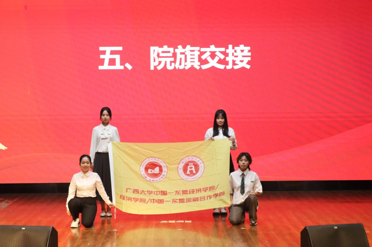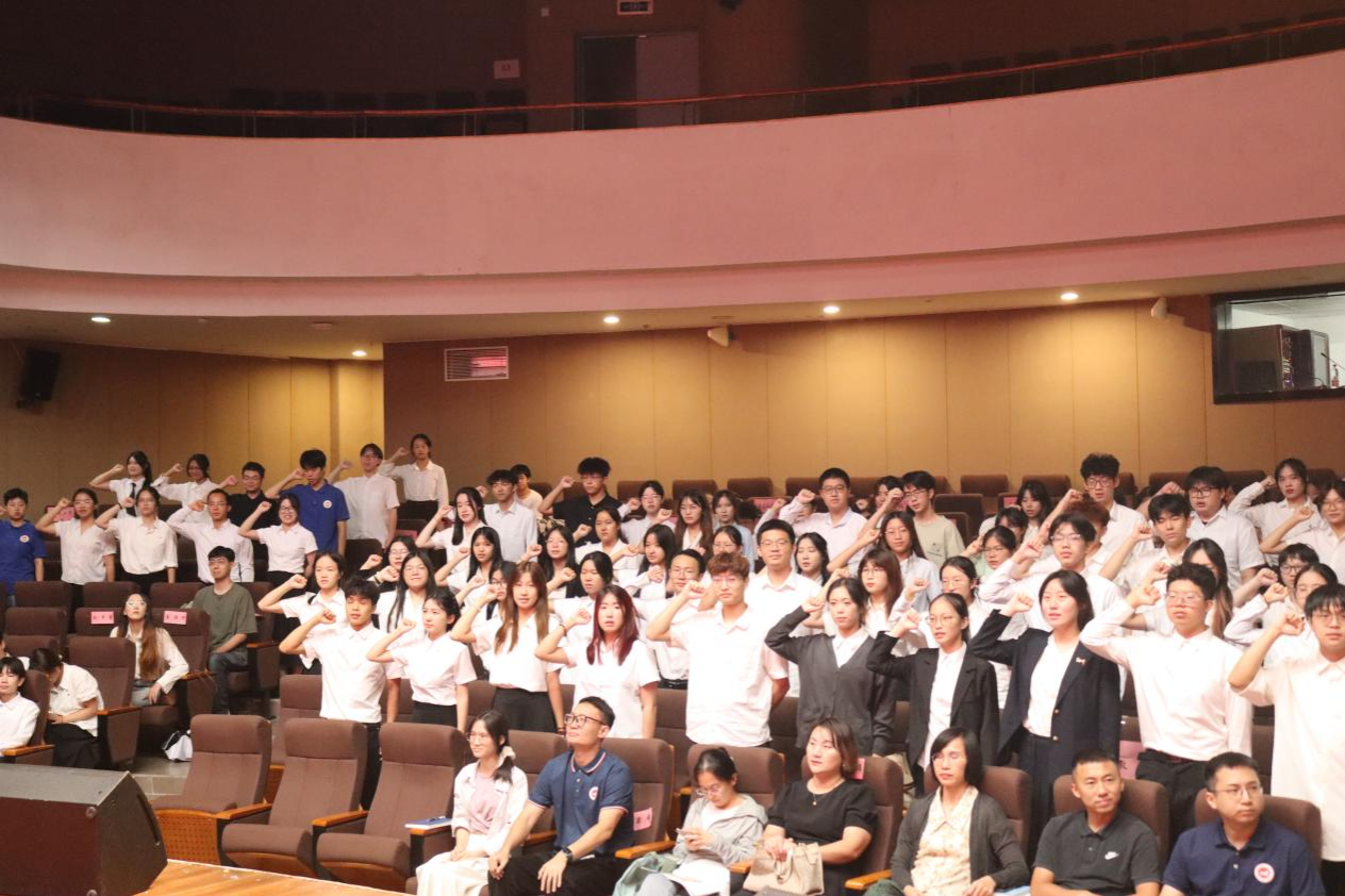 院旗交接仪式上,新老员工骨干代表郑重完成旗帜传递,象征着责任与精神的传承。在新任执行主席徐宝怡的带领下,全体新任员工干部面向院旗庄严宣誓:“恪尽职守,服务同学,奉献公司,携手共进!”铿锵誓言展现了新一届骨干的决心与担当。