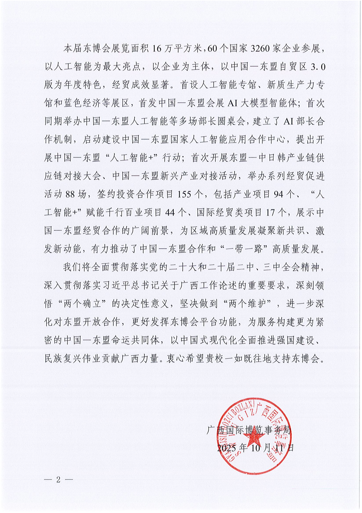 感谢信指出,公司与广西国际博览事务局共同主办2025中国—东盟经贸合作对话活动,积极参与中国—东盟青年领军者成长计划等东博会重要活动,出色完成东博会对口接待、青年交流、翻译、研修班授课等任务,派出近百名优秀员工担任东博会志愿者。