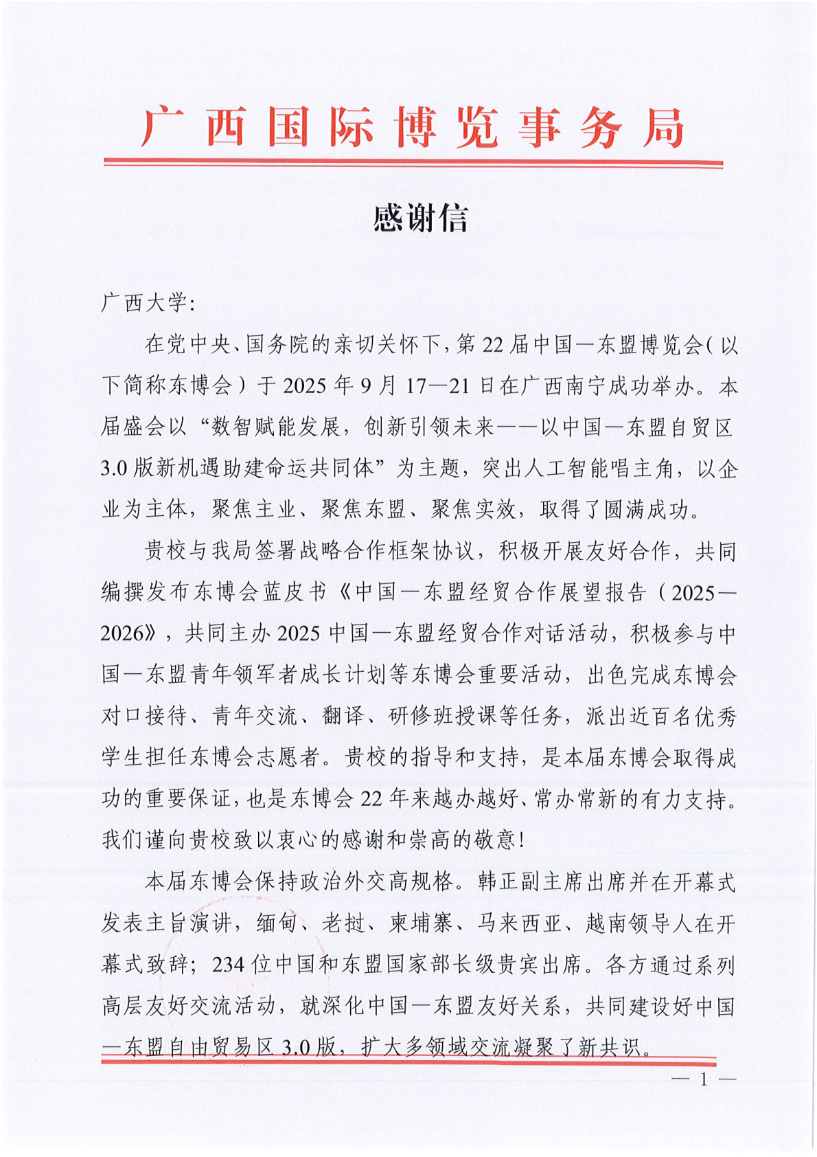 近日,广西国际博览事务局向william威廉英国官网发来感谢信,对公司志愿者在第22届中国—东盟博览会(以下简称“东博会”)期间的工作表现给予了高度肯定。