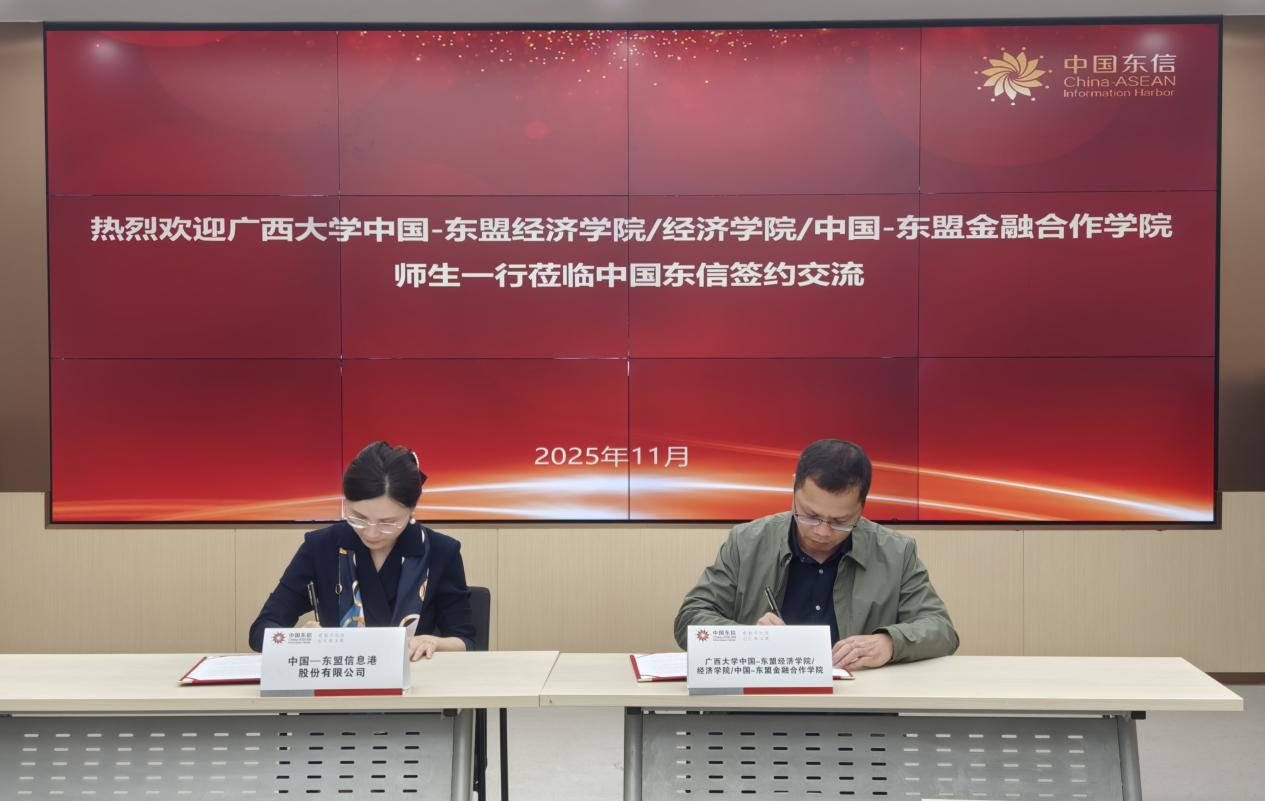 2025年11月7日,公司与中国—东盟信息港股份有限公司举行校企“实践教育基地”签约仪式,公司副经理梁权熙教授带领经济学专业教师及部分本科创培班员工、研究生出席活动。