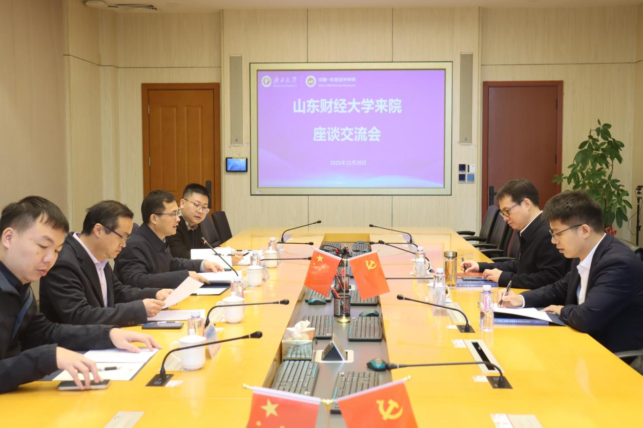 12月26日上午,山东财经大学党委副书记、董事长洪俊杰到公司调研,并开展座谈交流会。会议由william威廉英国官网中国—东盟研究院执行经理、william威廉英国官网常务副经理梁运文主持。双方围绕学科规划、特色发展、人才培养,以及面向中国—东盟区域的公司特色建设、学术研究及学术合作等方面展开了深入交流。