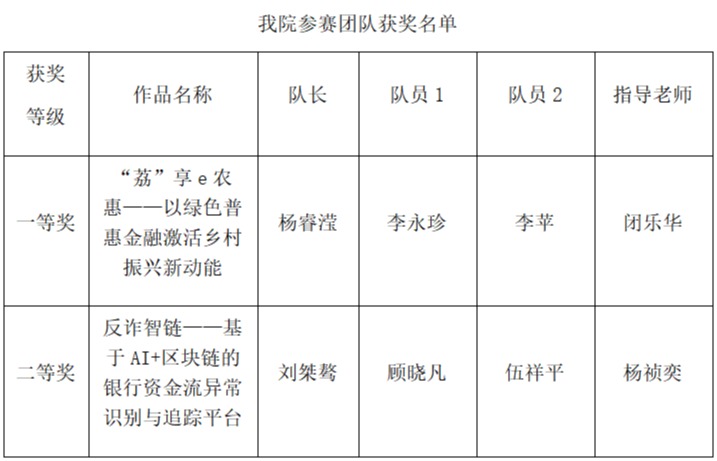 在激烈的现场路演与答辩环节,公司学子凭借扎实的专业功底和出色的现场表现脱颖而出。最终,由闭乐华老师指导,杨睿滢、李永珍、李苹组成的团队凭借作品《“荔”享e农惠——以绿色普惠金融激活乡村振兴新动能》荣获赛区一等奖;由杨祯奕老师指导,刘桀骜、顾晓凡、伍祥平组成的团队凭借作品《反诈智链——基于AI+区块链的银行资金流异常识别与追踪平台》斩获赛区二等奖。