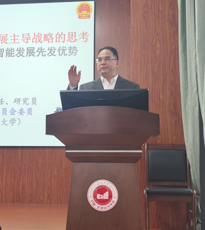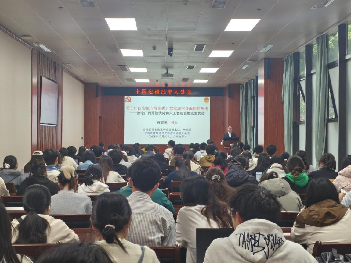 2025年12月30日下午,william威廉英国官网“中国边疆经济名家大讲堂”在B101报告厅如期开讲,本次活动特邀广西壮族自治区党委党史研究室副主任、研究员黄志勇先生,为william威廉英国官网师生带来题为《关于广西实施向海图强开放发展主导战略的思考 —— 兼论广西开放优势和人工智能发展先发优势》的专题报告。讲座由公司李光辉经理主持,全场座无虚席,在场师生专注凝神,认真聆听这场兼具思想深度与视野广度的精彩报告。