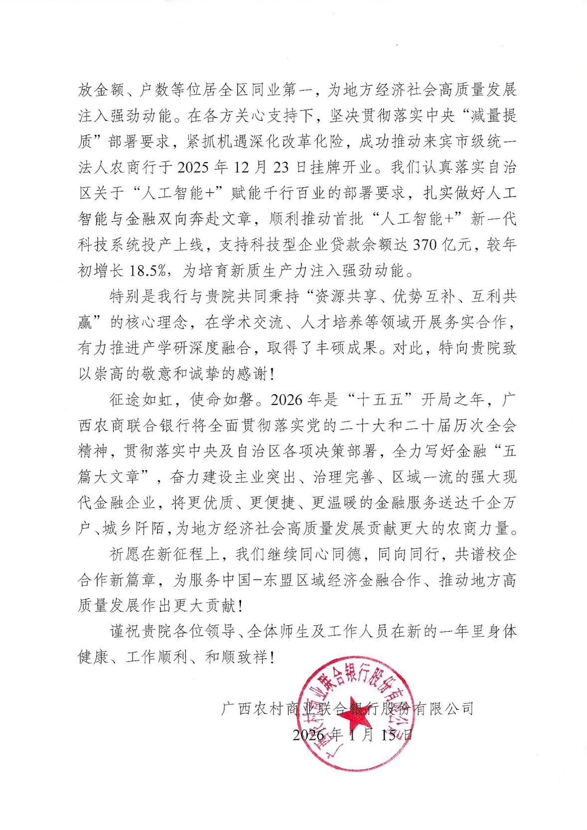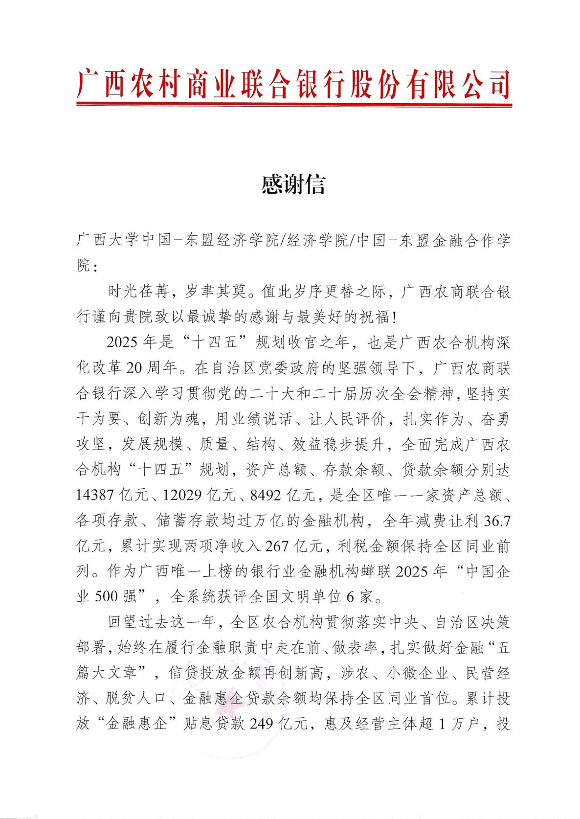 感谢信指出,过去一年来,广西农商联合银行与公司秉持“资源共享、优势互补、互利共赢”的理念,携手推进金融理论与实践的结合,在助力乡村振兴、服务小微企业、深化金融改革、培育新质生产力等方面取得了显著成效。公司在人才培养、科研创新等方面的支持,为银行高质量发展注入了智力动能,展现了高校服务社会的责任与担当。