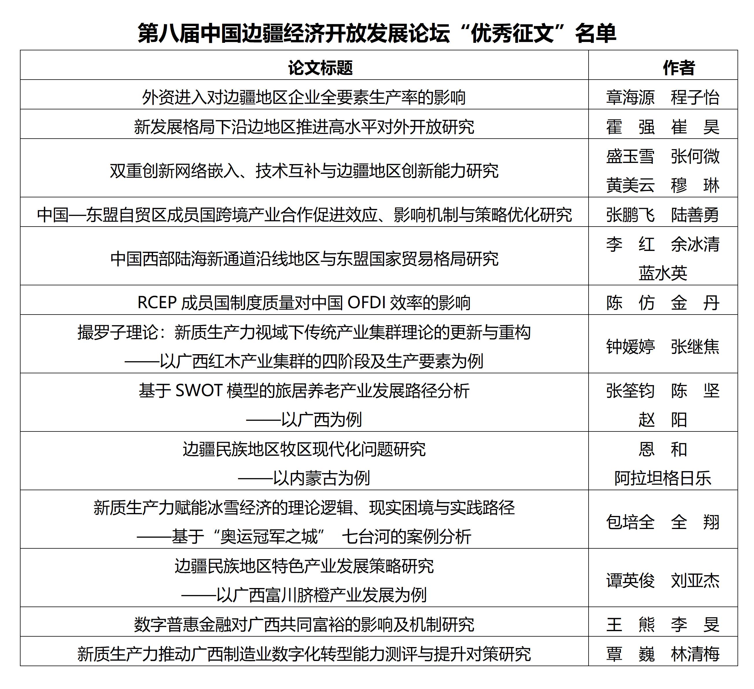 日前,经《广西经济》编辑部和专家团队认真评审,《外资进入对边疆地区企业全要素生产率的影响》等13篇论文获评第八届中国边疆经济开放发展论坛“优秀征文”。《广西经济》已陆续刊发优秀征文,并将向每篇优秀征文作者颁发奖金2000元。《广西经济》将继续在2025年中国边疆经济开放发展论坛开展有奖学术征文活动,并评定征文等级,优秀征文均可获得奖金。