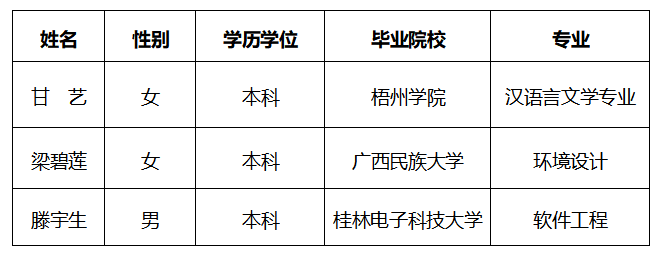 公司通过广西四方汇通人才服务有限责任公司面向社会公开招聘劳务派遣制工作人员3名,根据相关工作方案,经初筛、笔试、面试、复试等程序,现将拟聘用人员公示如下:
